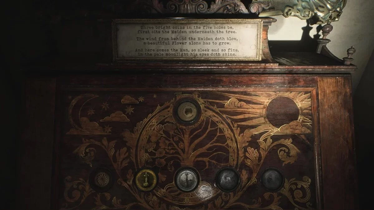 - Легкая сложность: серебряная монета с мужчиной в первую лунку. Золотая монета с женщиной в третью. Бронзовый подсолнух в пятую. Нажмите кнопку. Не перемещайте и не трогайте монеты, чтобы не сбить повествование загадки.