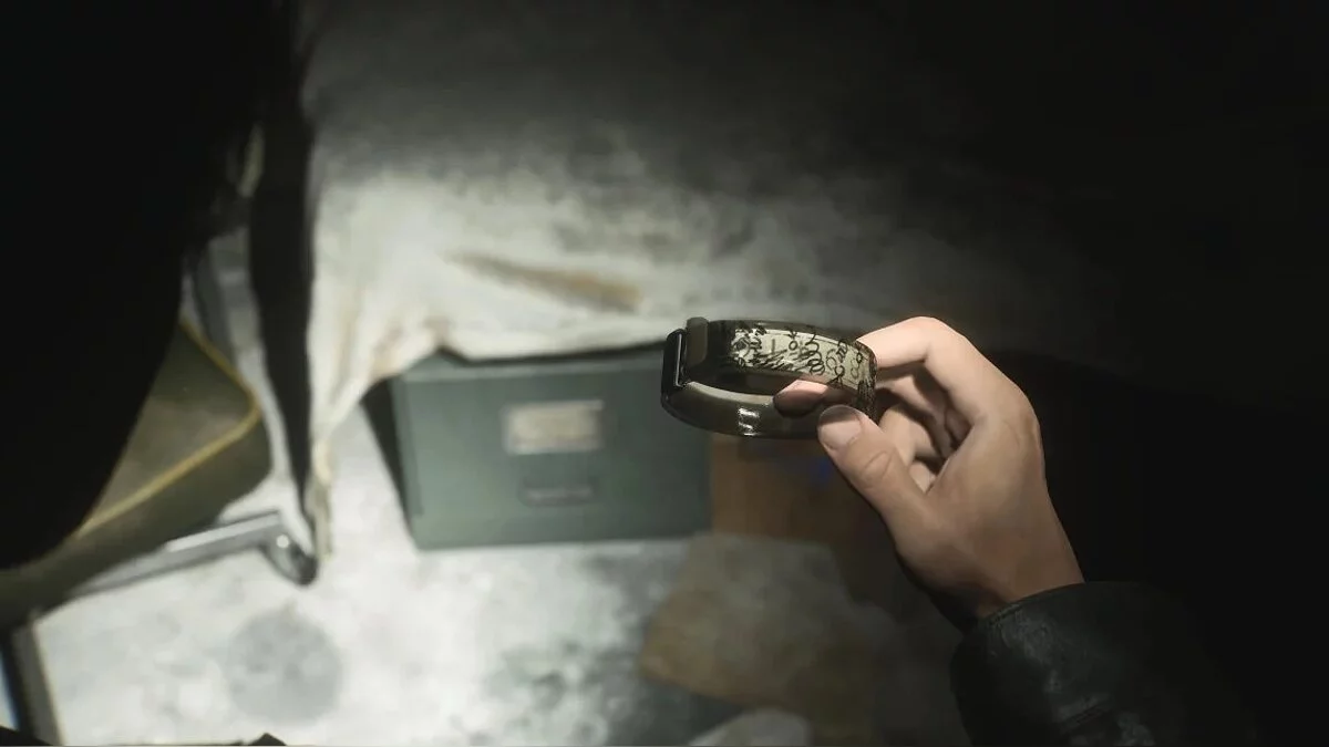 Браслет находится в бассейне на первом этаже. Вам нужно сначала слить с него воду. Для этого вам нужно объединить медицинскую трубку (она лежит в соседней душевой) с изогнутой игрой (ее вы найдете в кладовой). Используйте крючок на сливе, который находится в аптеке. Так вы откроете решетку с наносом. Осушите бассейн и спрыгивайте вниз. Сломайте стену, чтобы получить доступ к браслету.