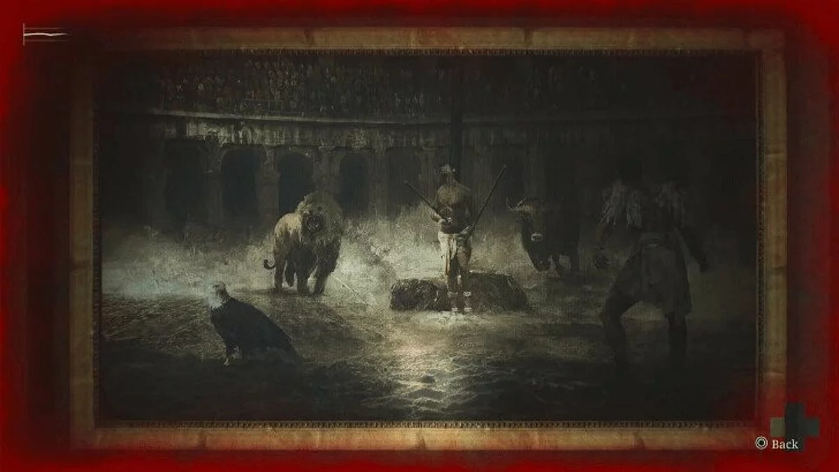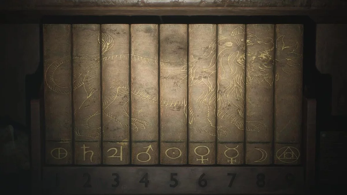После решения головоломки с браслетами вы должны открыть запертую дверь напротив точки сохранения. Внутри вы найдете кнопку от сейфа и коллекцию книг, которые вам нужно расставить так, чтобы на корешках появилось изображения льва. Вернитесь к сейфу и воткните кнопку в паз.