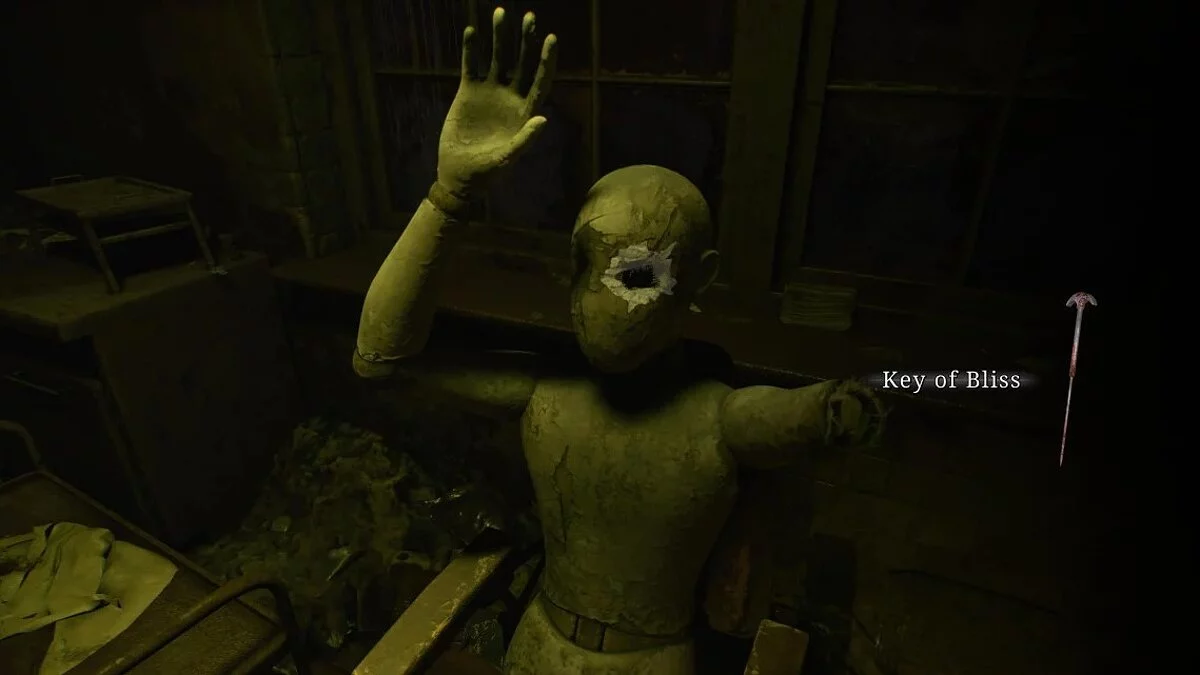 Отправляйтесь в левую часть второго этажа. Поднимитесь по лестнице на третий. Посетите четвертую смотровую комнату. На хирургическом кресле будет сидеть манекен. Используйте инструмент, который лежит рядом на манекене. Идите в палату D2. Проломите дыру в стене и заходите в палату D1. Спуститесь по лестнице на кухню первого этажа. Пройдите через отверстие в стене и возьмите «Ключ Блаженства». Возвращайтесь к манекену и используйте предмет. Вы получите ключ, который можно использовать на прикованном ящике.