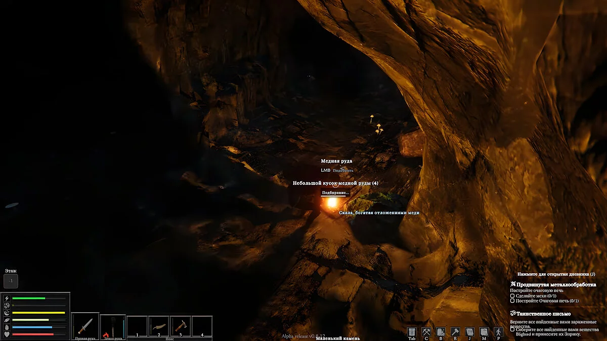 - Отправляйтесь на поиски руд. Медь, олово и особенно железо вам пригодятся в дальнейшем выживании;