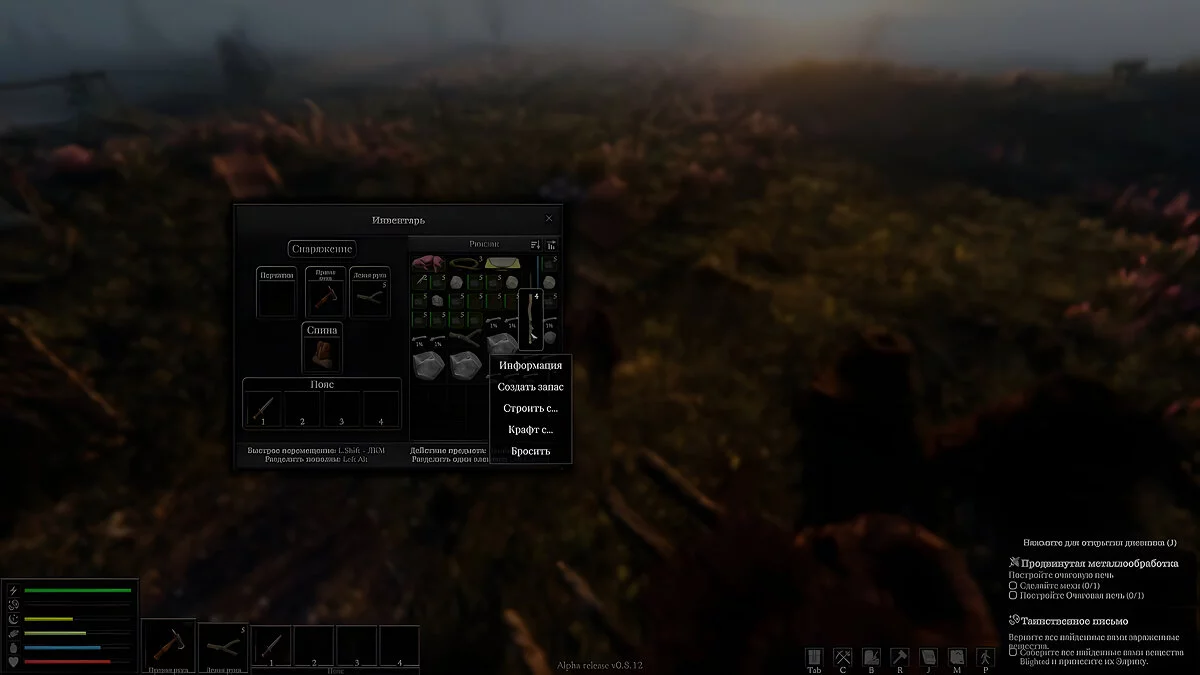 В игре также существует инвентарь, главный лимит в котором — ячейки, доступные для ресурсов. Роль играет и суммарный вес предметов. Если у вашего персонажа будет перегруз, то это повлияет как на скорость перемещения, так и на скорость восстановления выносливости.