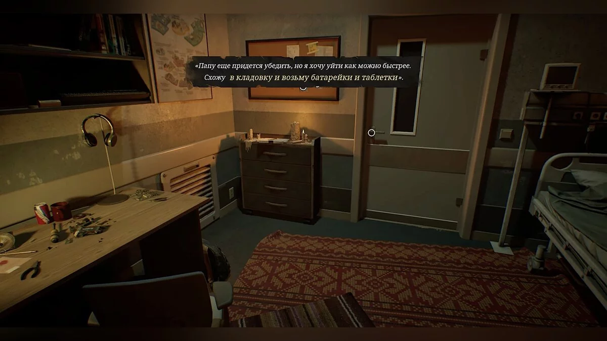Выходите из комнаты и следуйте дальше по коридору. Когда задание обновится, возвращайтесь в комнату, используя маркер цели. После матраса, через который вы уже пролазили, открытая дверь. Это комната отца Алекс. На столе лежит чемодан, в котором много баллончиков от астмы.
