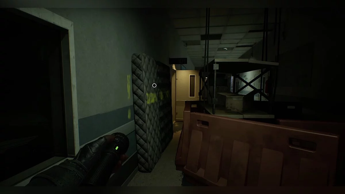 Выходите и идите направо. Пролезьте между матрасом и идите дальше по коридору. На развилке поверните налево и спускайтесь по лестнице. Далее снова налево до конца коридора, а затем направо. Справа будет незапертая дверь. Заберите внутри батарейки и таблетки.