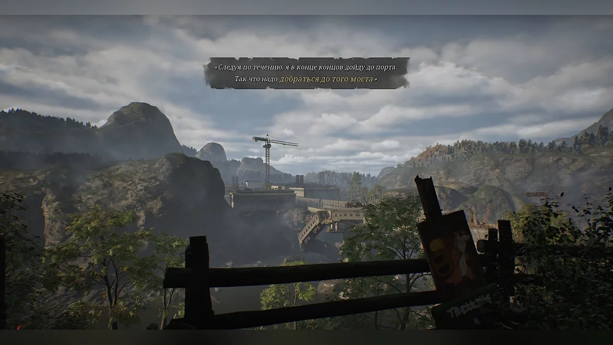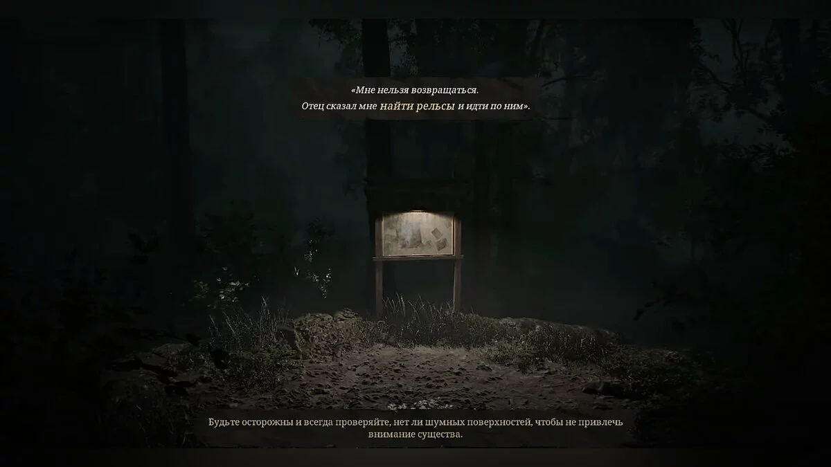 Когда окажетесь в лесу, спрыгните с уступа. Ваша задача — найти рельсы. Впереди освещенная доска информации.