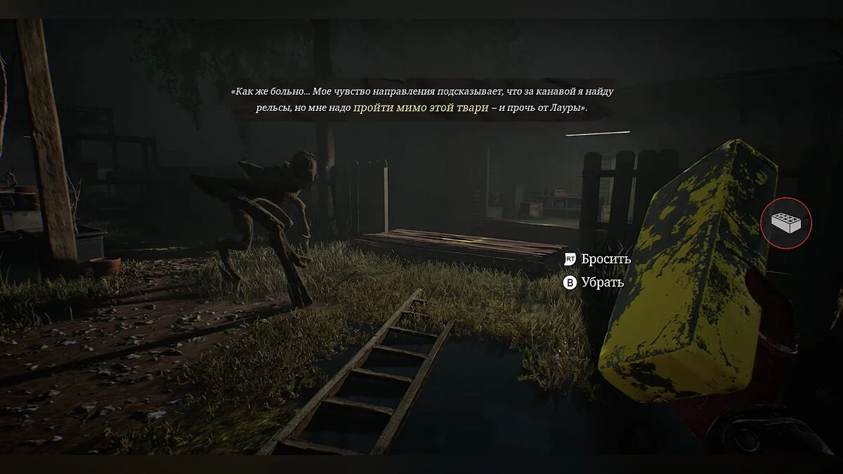 По единственному пути двигайтесь далее, пока не выберетесь из вагонов. Можно не скрываться, так как шум воды скроет шаги. Вас обучат новой вводной — существа могут фокусироваться, после чего нужно вообще не двигаться. Вам нужно двигаться по воде, замирая всякий раз, когда слышите характерный звук. Добравшись до заграждения, перелезьте. Снова появятся существа. Продолжайте движение, но держитесь правее. Вам нужно найти лестницу наверх. Когда заберетесь будет еще одна. После этого героиня зашумит и придется бежать. Просто двигайтесь направо и не останавливайтесь. Препятствий будет немного. В итоге героиня проскользнет в дом, и запустится флешбэк.