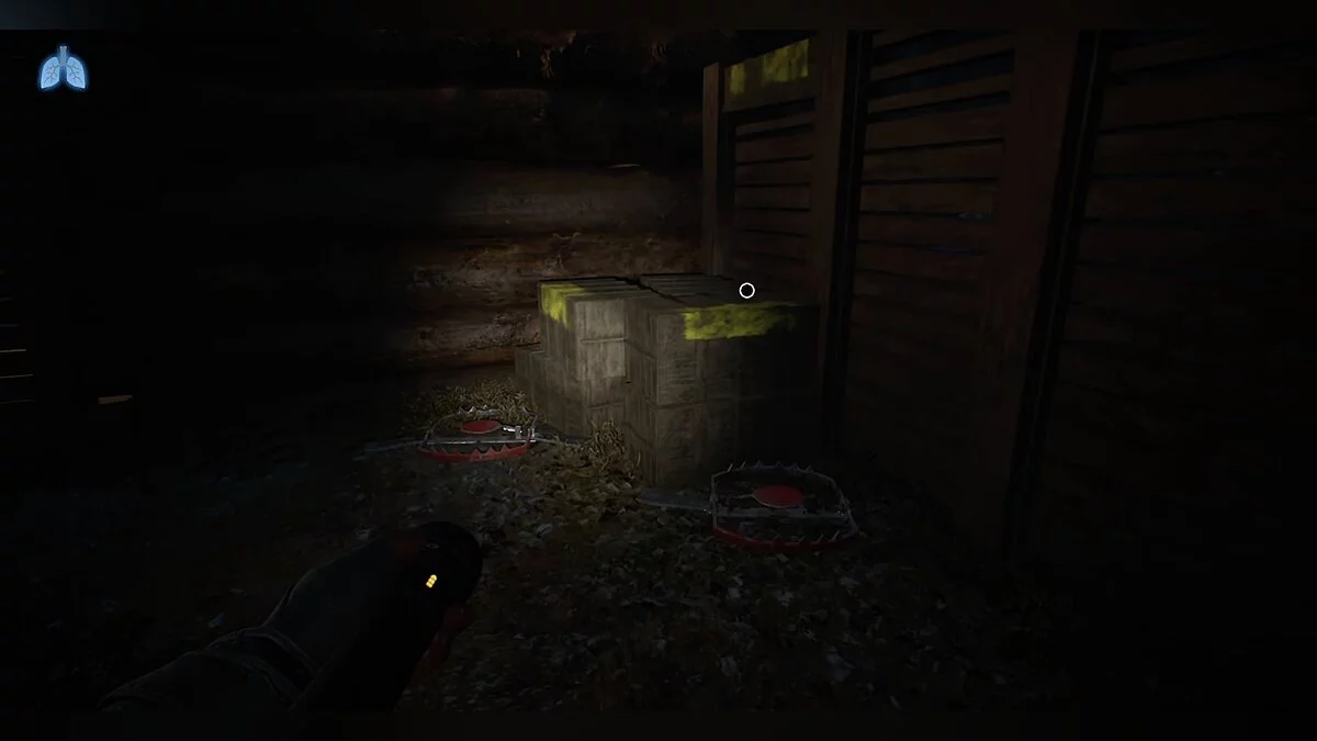 Впереди бревна. Слева капкан, а справа бочки. Подойдите к капкану и посмотрите направо. Там можно пролезть. Продолжайте идти вперед, пока не увидите ворота. Подойдите к ним и заберитесь на ящики слева. Оказавшись за воротами, медленно двигайтесь вперед. Когда увидите растяжку, справа можно пролезть. Впереди будут другие ловушки и капканы. Держитесь левее и увидите ящики. Переберитесь через забор. Впереди будут баллончик, вам же налево.