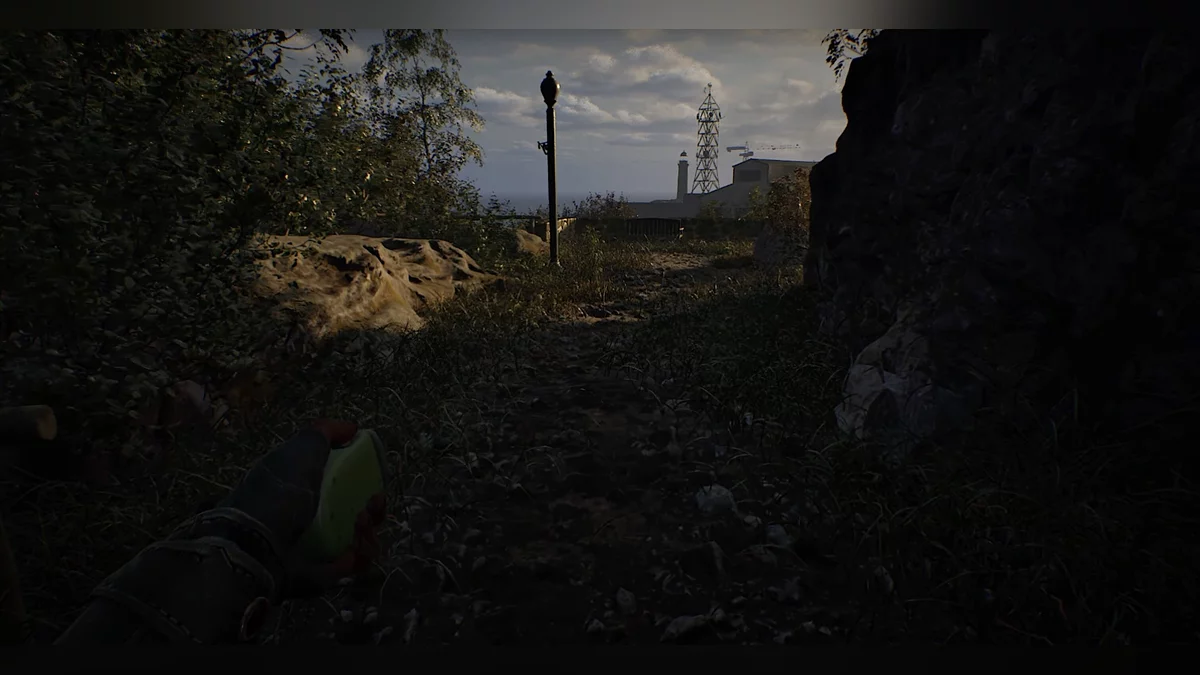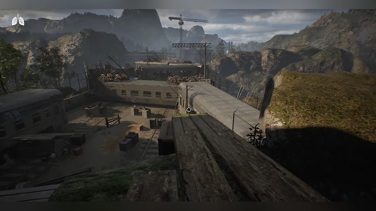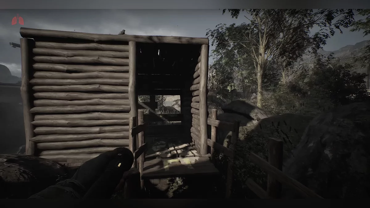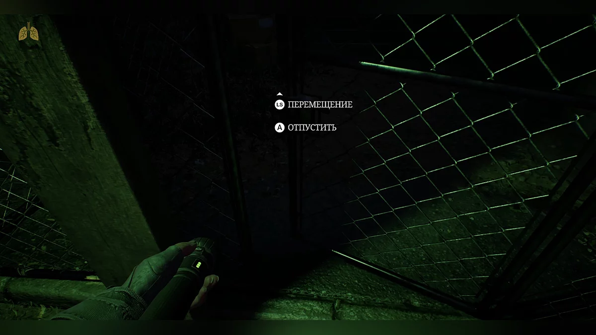 Держитесь левее, а затем поверните направо, чтобы спуститься с уступа. Продолжайте движение к фонарям. В итоге вы доберетесь до строения, дорога ведет через упавшее бревно, проползите под ним и проберитесь через дыру в решетке.