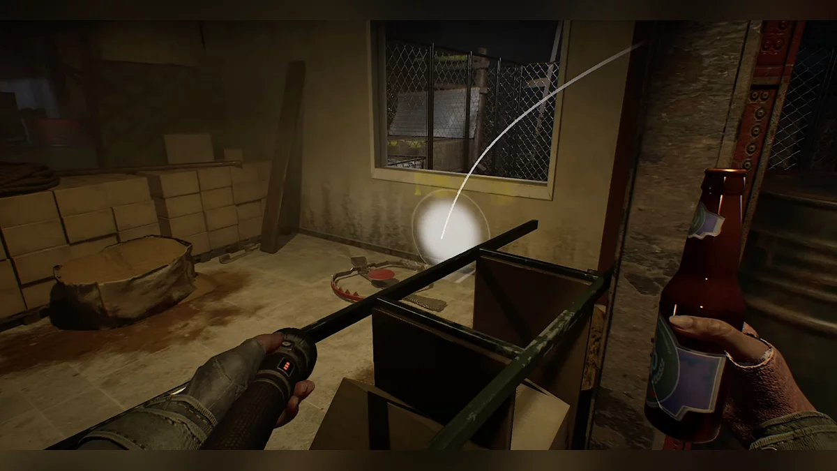 Левее от вашей позиции еще один забор, подсвеченный зеленой лампочкой. Там дверь открыть можно. Пройдите через нее и увидите окно ближайшего здания. Там можно пролезть, но делать это пока рано, на другой стороне капкан. Пройдите до конца доступной зоны, чтобы подобрать бутылку, а затем швырните ее из точки, где будет виден капкан. Приготовьтесь, что это вызовет шум. Оказавшись внутри, сразу же направляйтесь к противоположной стене. Там справа можно протиснуться между ящиками.