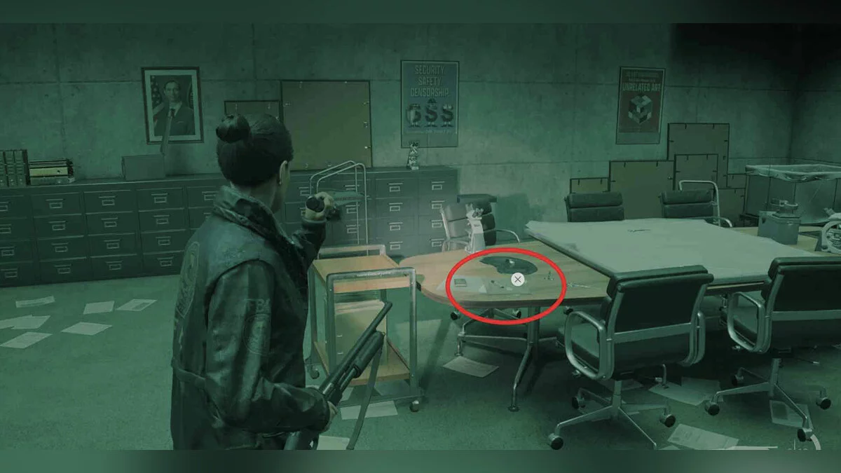 Вернитесь к большому помещению сразу после коридора с лифтом, и там пройдите в помещение для службы охраны.