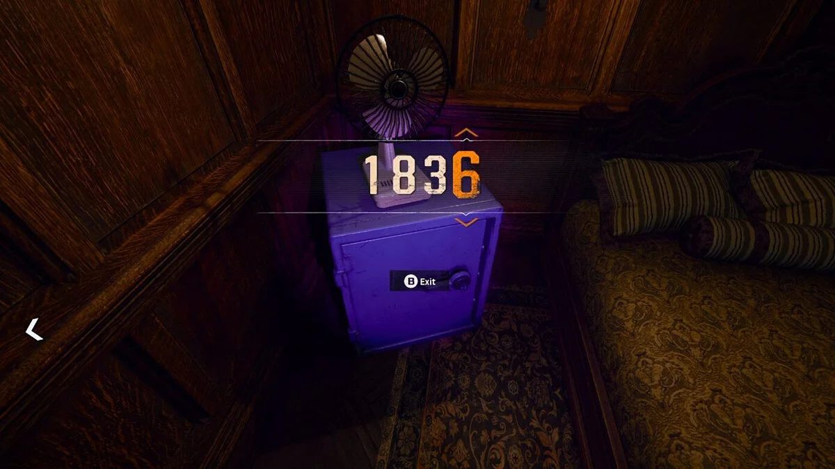 После этого поднимитесь в спальню и введите код, основанный на найденных числах, чтобы открыть сейф.