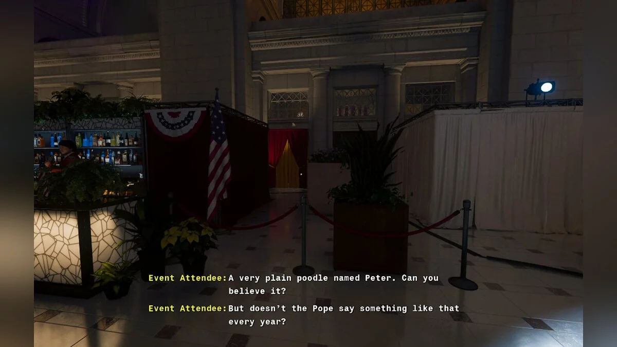 Как только вы войдете в торжественный зал, поверните направо и пройдите сквозь золотые занавески, между баром и белой огороженной зоной. Будьте осторожны и избегайте охранника, спрятавшись за растением.