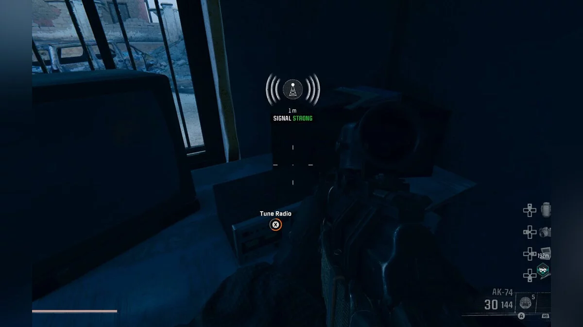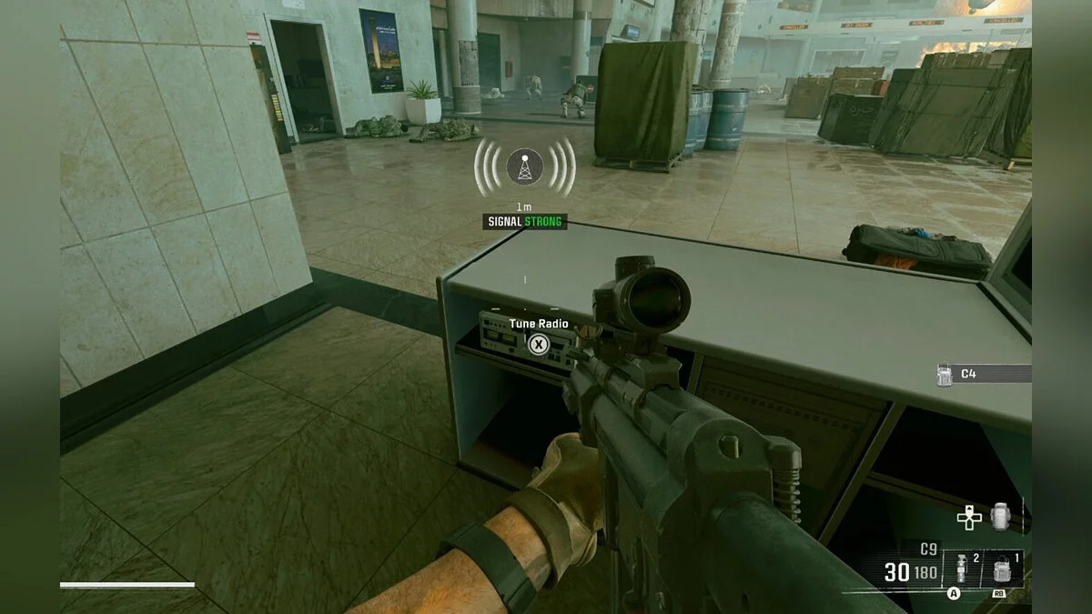 Завершая эту миссию, вы доберетесь до аэропорта и столкнетесь с множеством врагов в зоне регистрации. В конце помещения вы увидите несколько столов, а радиоприемник будет находиться на полках под ними.