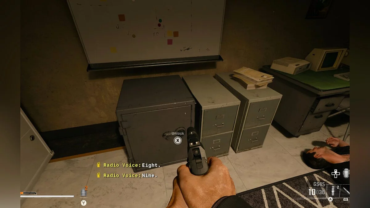 Войдите внутрь здания и поднимитесь на верхний этаж, чтобы прослушать код из радио, расположенное на верстаке. Сейф вы найдете позади вас в этой же комнате.