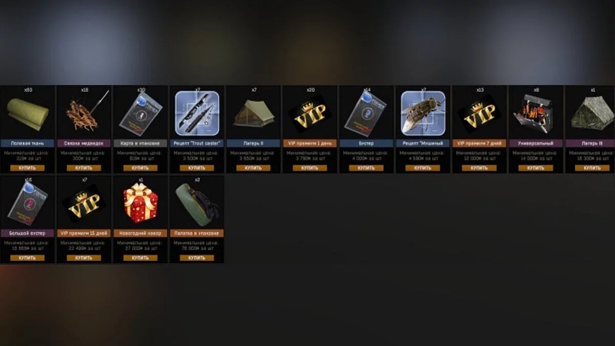 Палатка 5: Донатная. Работает так же как палатка номер 4. Стоимость 10$. Ограничение по размещению всех палаток -не более 15 штук на всех водоемах. Во время установки на земле палатки, она исчезает из слота, а во время сбора появляется в инвентаре если слотов недостаточно. Таким образом не возникает проблем с тем что слотов мало а палаток может быть аж 15 штук.