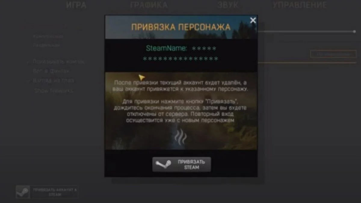 Запускаем Steam клиент, чтобы он работал в фоновом режиме. Это обязательное условие для привязки. Саму игру на Steam не запускаем. После окончания установки игры на VK Play,заходим в игру через портал VK Play а не через Steam клиент. Не перепутайте ярлыки, лучше заходите из окна самой платформы. На главной странице игры нажимаем «Начать игру». после чего система предложит создать нового персонажа. Вводим ник, можно написать абсолютно любой ник какой хотите, это не важно и входим в игру. После появления на стартовой локации можно переходить к перепривязке к аккаунту Steam. Нажимаем кнопочку Esc и переходим во вкладку Игра. Там вы увидите кнопочку «Привязать аккаунт Steam» Если данная кнопка не появилась значит у вас возможно не запущен Steam.Проверьте еще раз и перезапустите игру. Нажимаем на кнопочку «Привязать аккаунт Steam» и перед вами выскочит окно привязки персонажа где будет обозначен ваш аккаунт Steam, игровой аккаунт с уровнем и никнеймом персонажа и кнопка "Привязать (см. скриншот) Внимательно проверьте и убедитесь что это действительно тот аккаунт который вы хотите привязать.