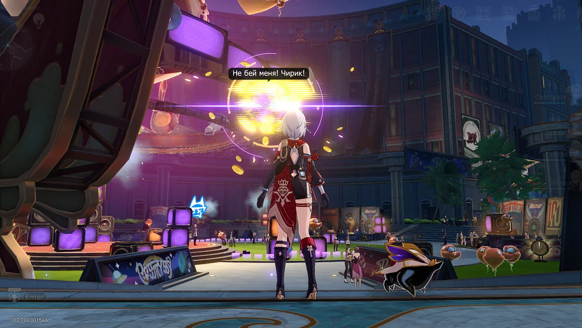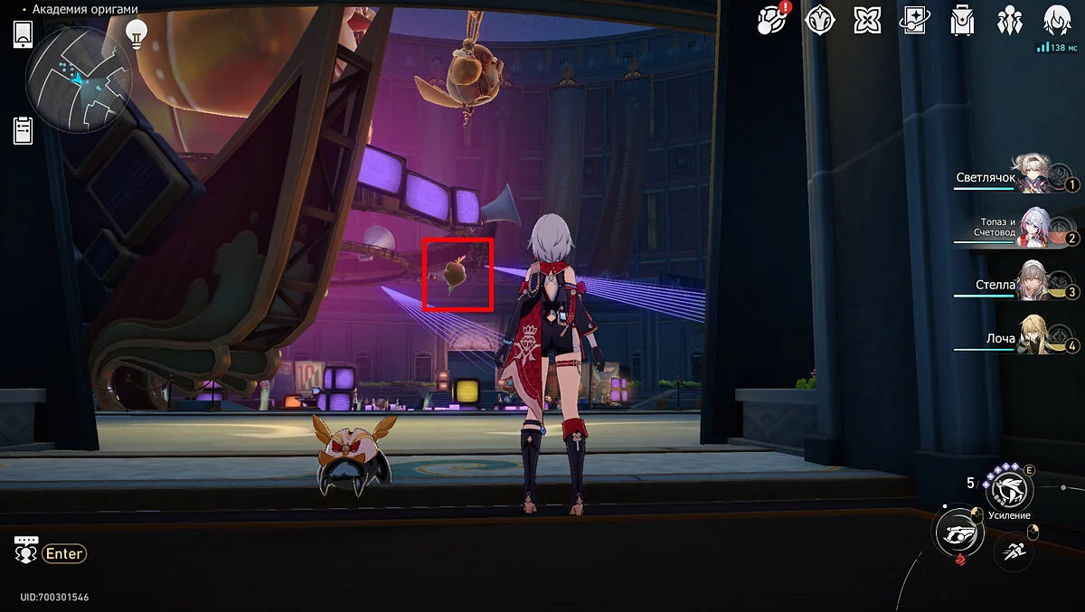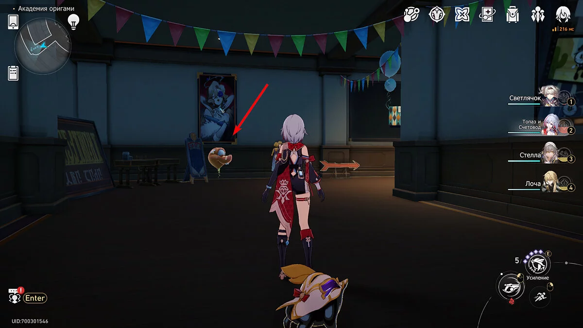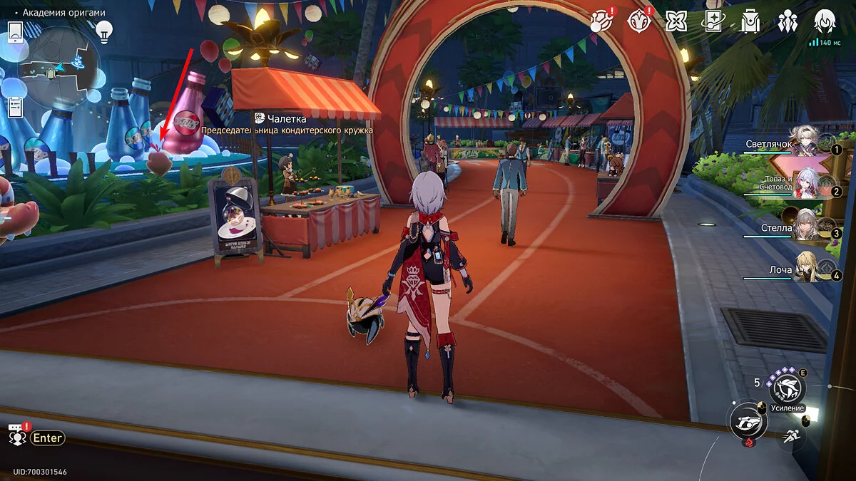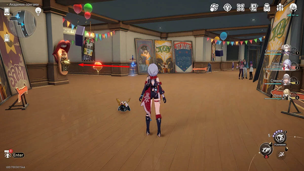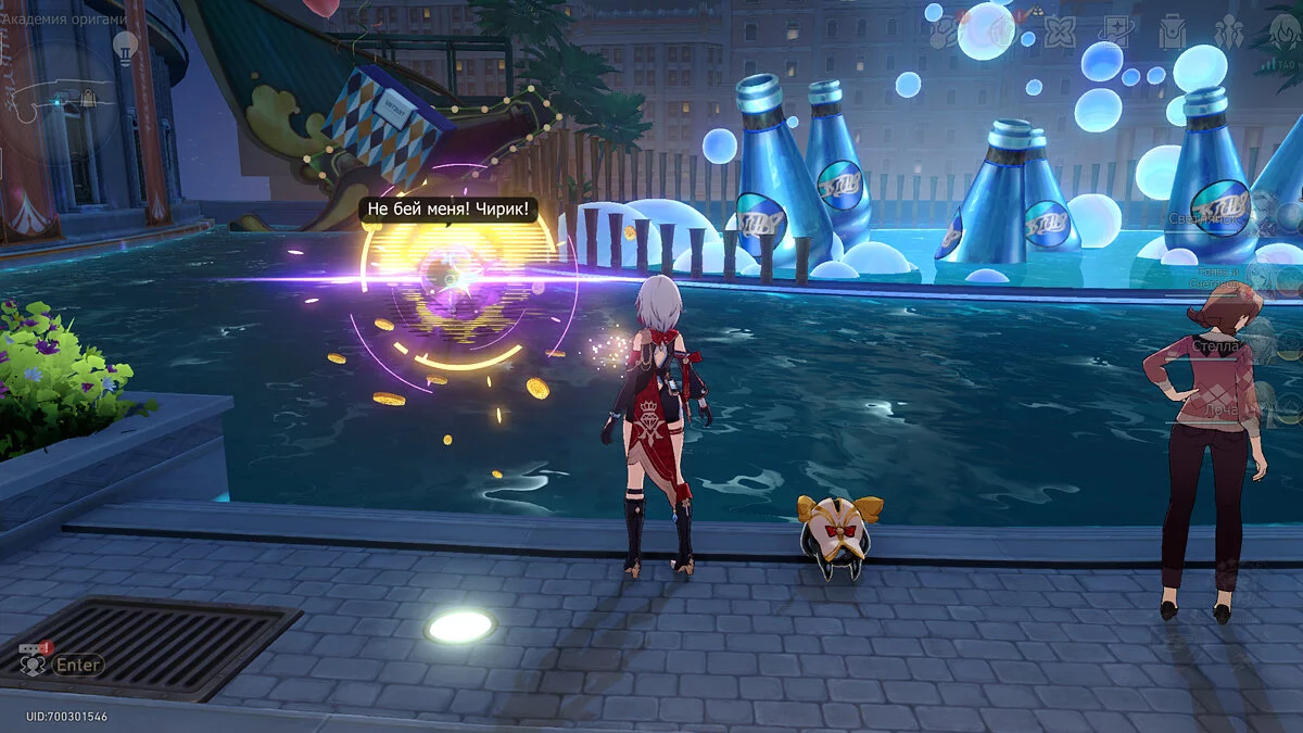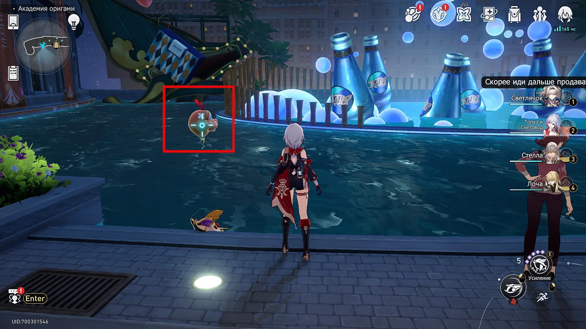 Пройдите дальше до очередной развилки около пространственного якоря и сверните налево, к творческой ярмарке. Держитесь левой стороны, около фонтана с водой. Именно над ней будет парить воздушный шар с птахой. Чтобы её достать, выстрелите в него любым персонажем с дальними атаками (Март 7, Топаз, Броня). После чего поговорите с птенцом и отправляйтесь на поиск следующих.