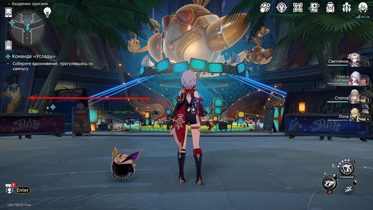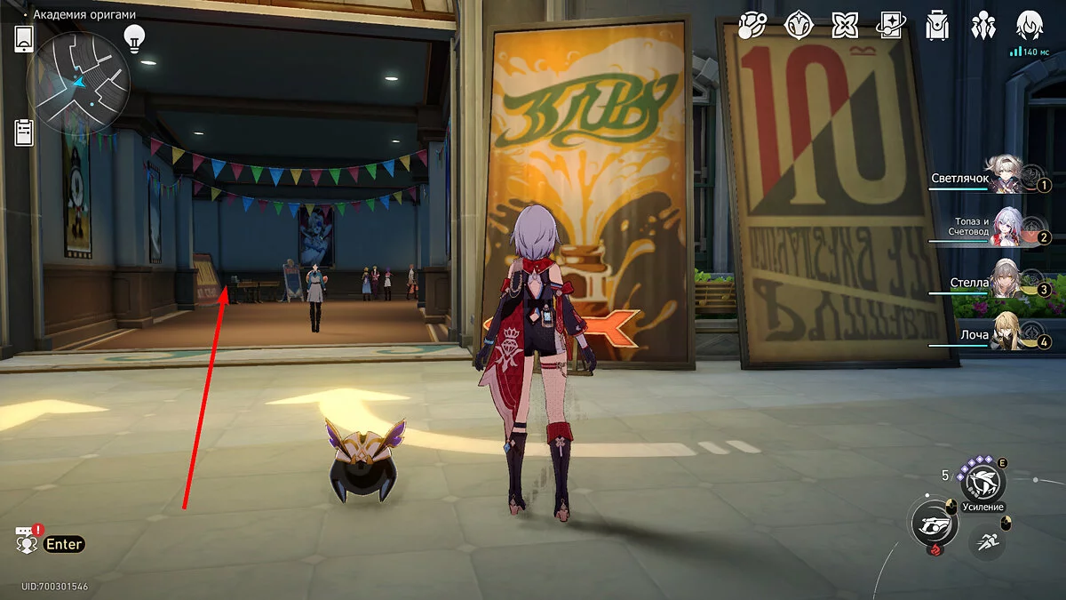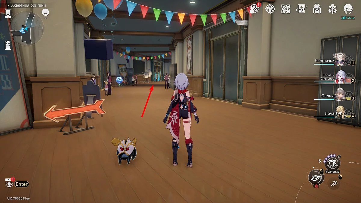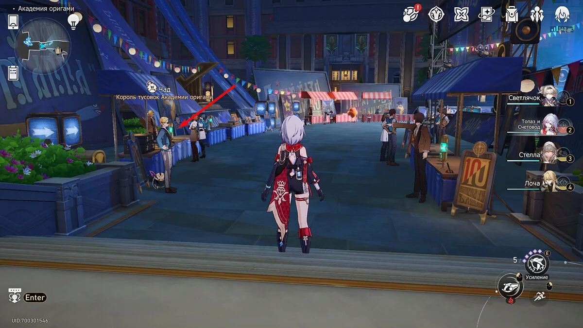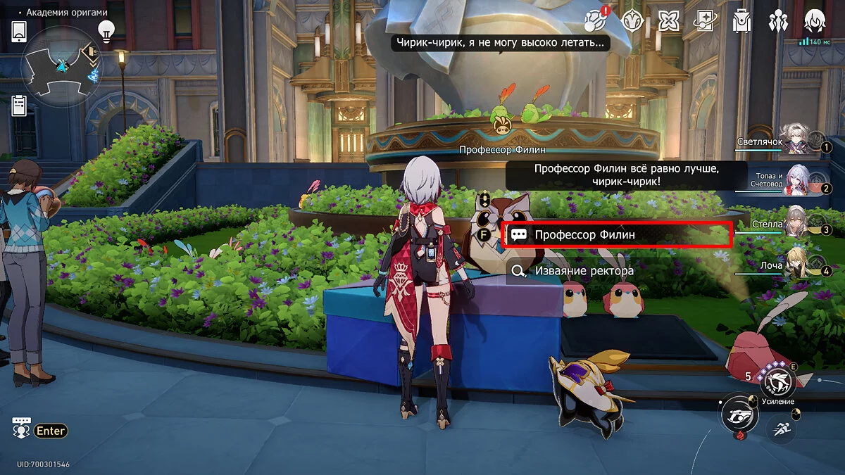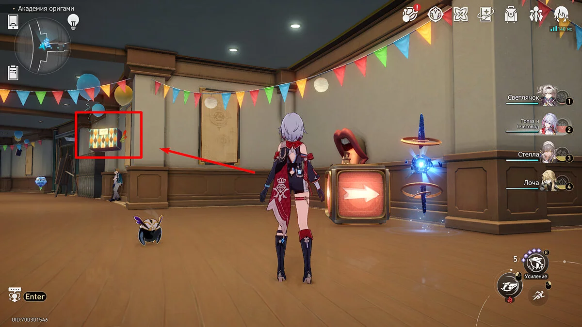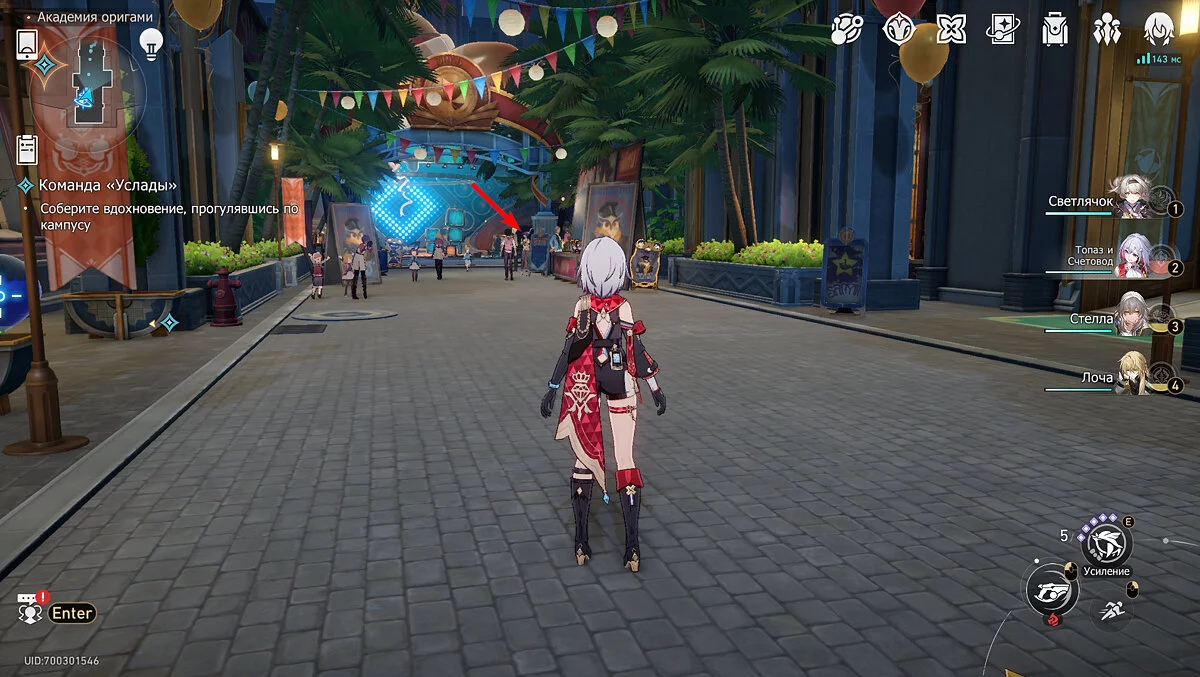 Пройдите дальше до очередной развилки около пространственного якоря и сверните налево, к творческой ярмарке. Держитесь левой стороны, около фонтана с водой. Именно над ней будет парить воздушный шар с птахой. Чтобы её достать, выстрелите в него любым персонажем с дальними атаками (Март 7, Топаз, Броня). После чего поговорите с птенцом и отправляйтесь на поиск следующих.