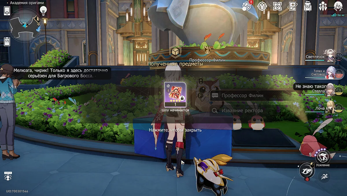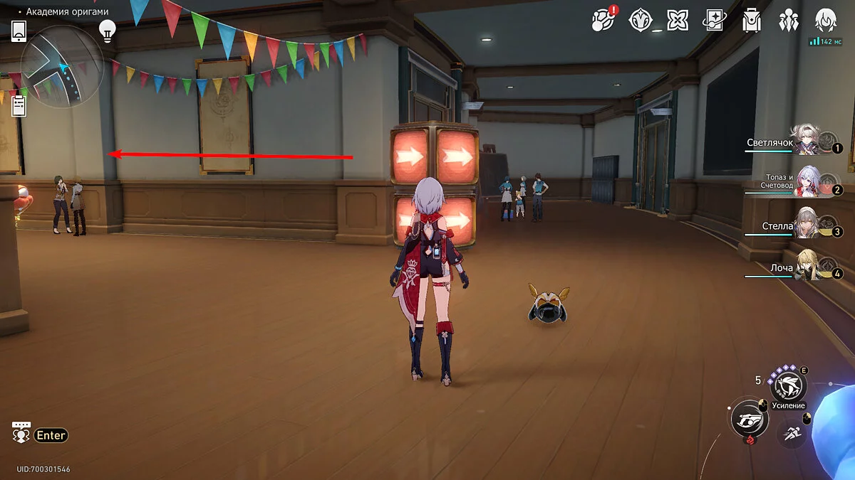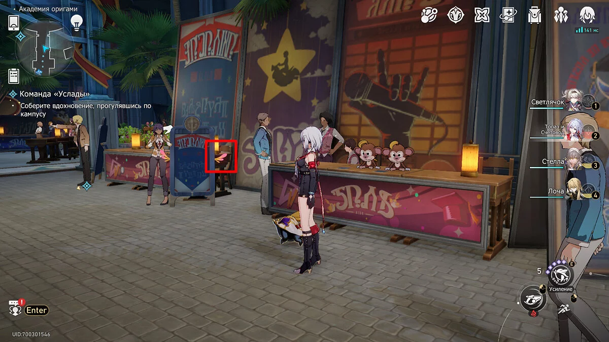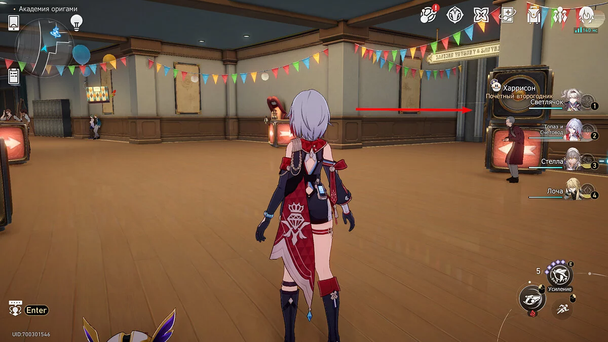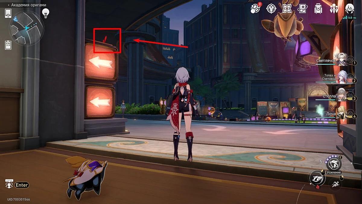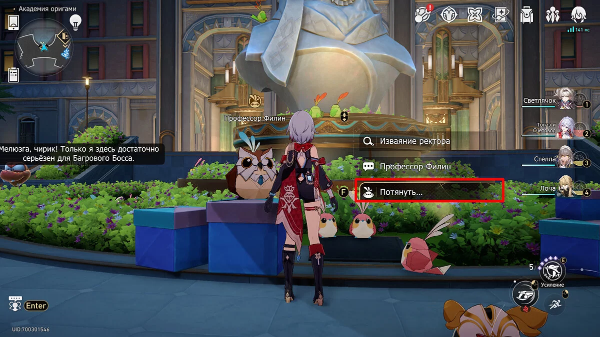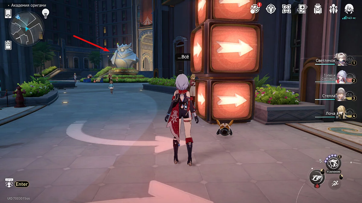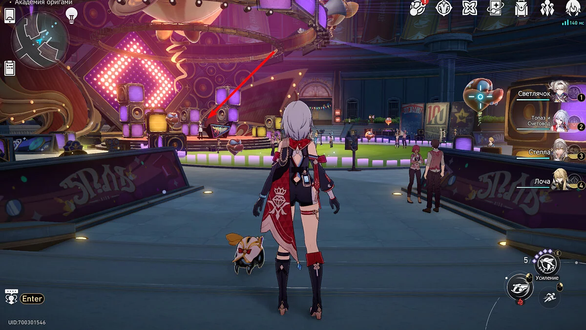 Пройдите дальше до очередной развилки около пространственного якоря и сверните налево, к творческой ярмарке. Держитесь левой стороны, около фонтана с водой. Именно над ней будет парить воздушный шар с птахой. Чтобы её достать, выстрелите в него любым персонажем с дальними атаками (Март 7, Топаз, Броня). После чего поговорите с птенцом и отправляйтесь на поиск следующих.