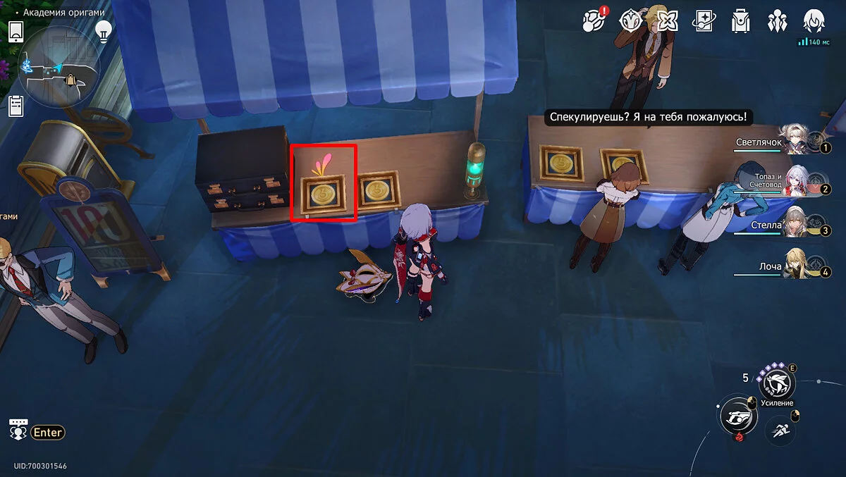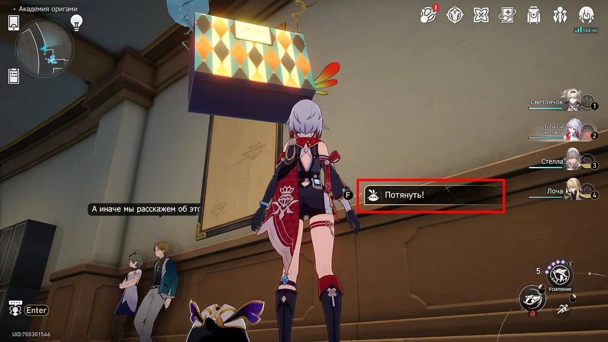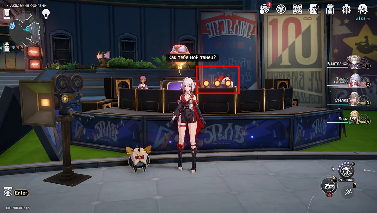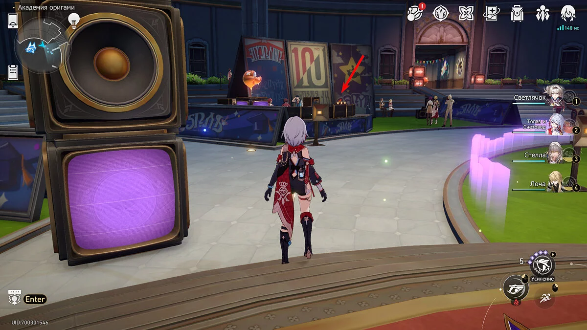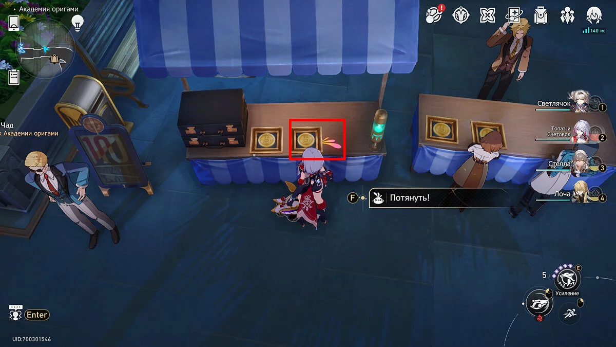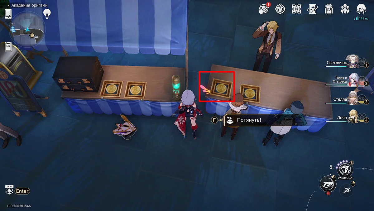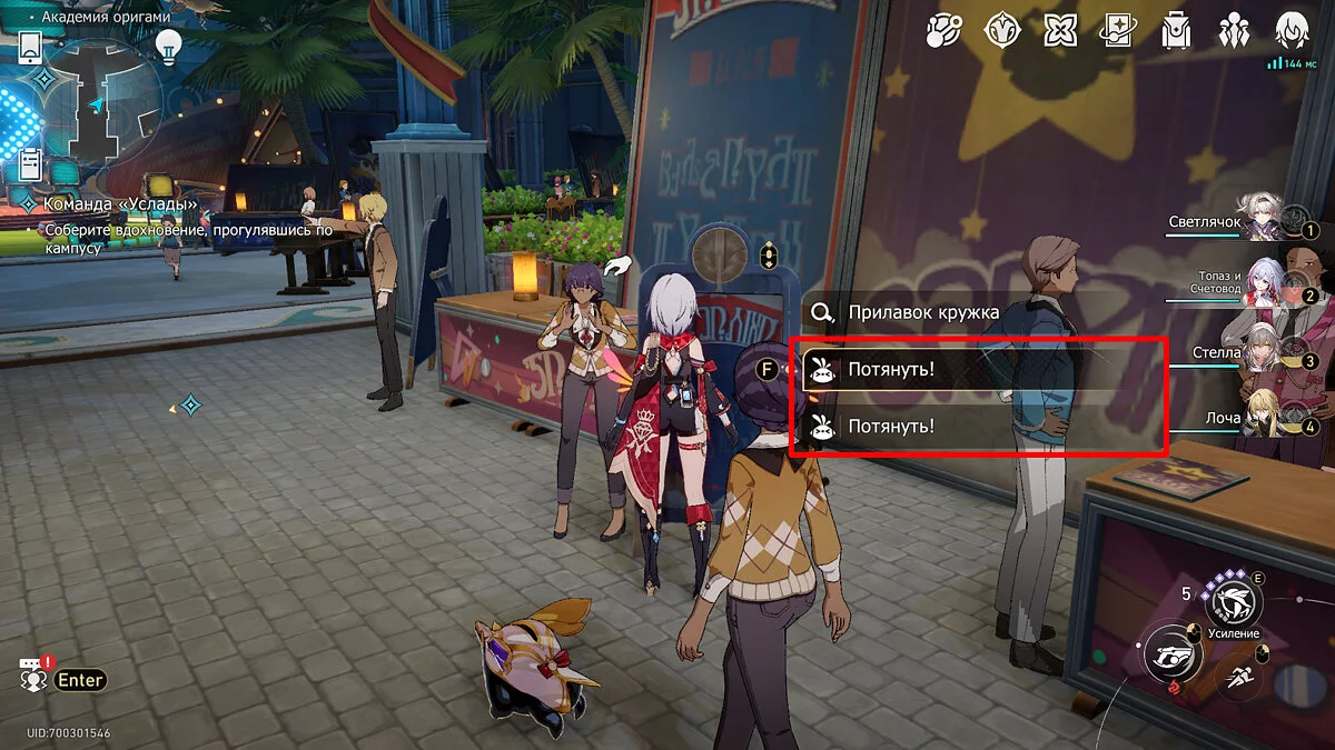 Пройдите дальше до очередной развилки около пространственного якоря и сверните налево, к творческой ярмарке. Держитесь левой стороны, около фонтана с водой. Именно над ней будет парить воздушный шар с птахой. Чтобы её достать, выстрелите в него любым персонажем с дальними атаками (Март 7, Топаз, Броня). После чего поговорите с птенцом и отправляйтесь на поиск следующих.