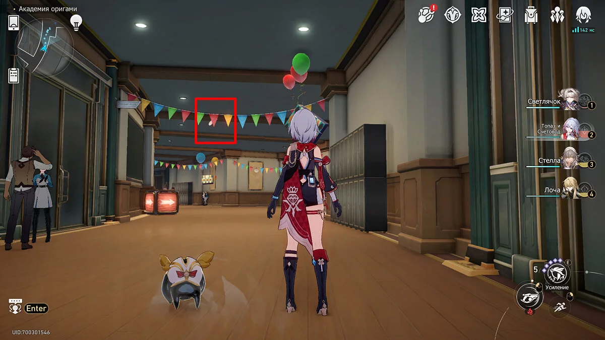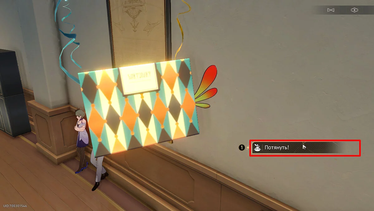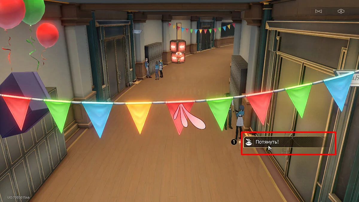 Вернитесь к пространственному якорю около Коридора Культуры и пройдите чуть вперёд от него по коридору. Обратите внимание на парящую на воздушных шарах подарочную коробку, потому что из неё будет торчать хохолок птички-оригами салатового цвета. Два раза потяните его, послушайте поздравление с днём рождения, после чего птенец улетит.