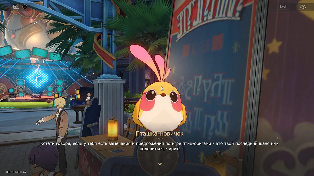 От предыдущей птички идите к диджейской стойке напротив, которая будет находиться чуть правее сцены. Определить её можно по множеству аппаратуры и трём баннерам за ней. Очередная пташка спряталась в причудливом устройстве с тремя прожекторами наверху. Потяните за пучок салатовых перьев, поговорите с птахой-диджеем и отправьте её в гнездо.
