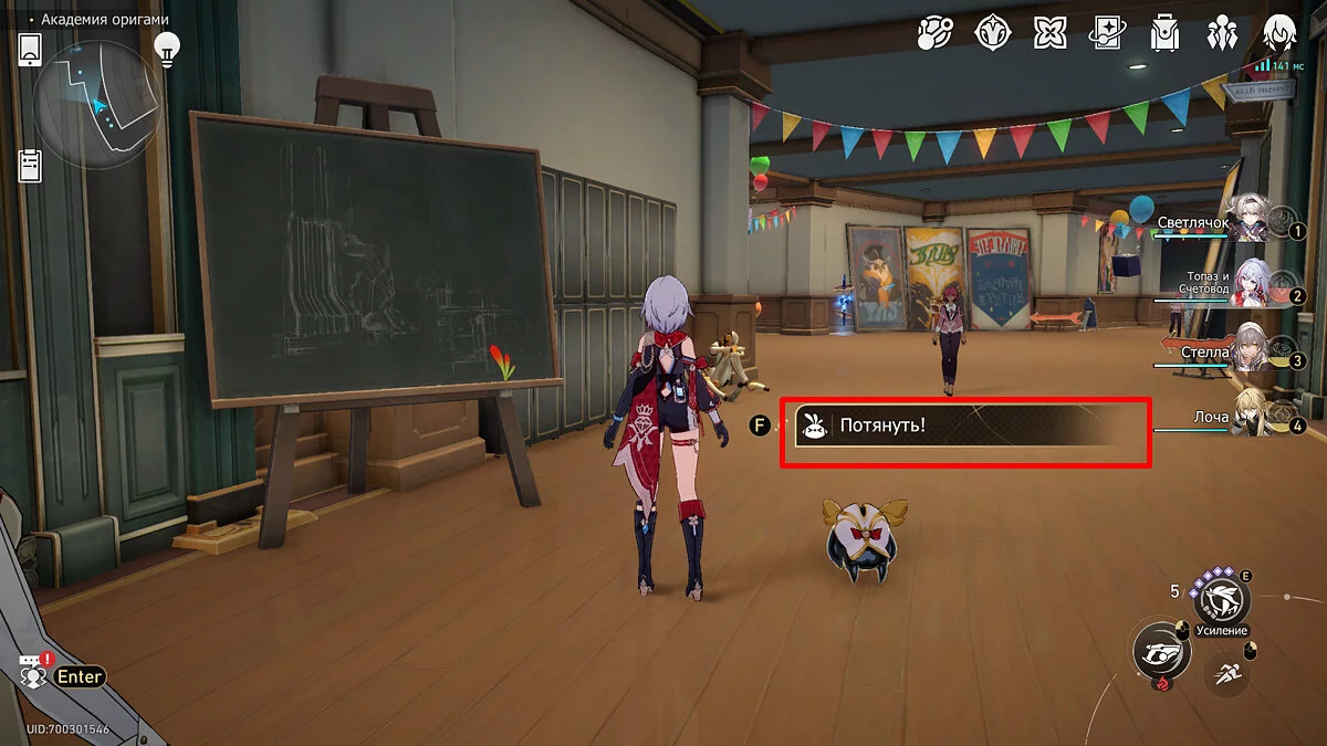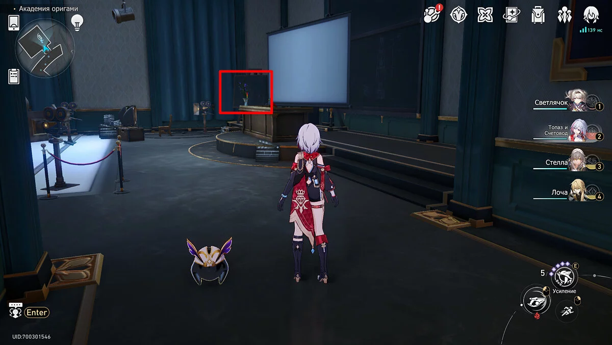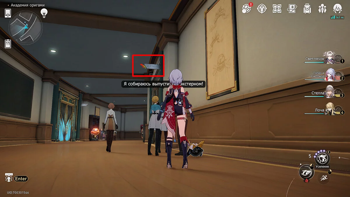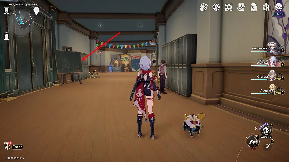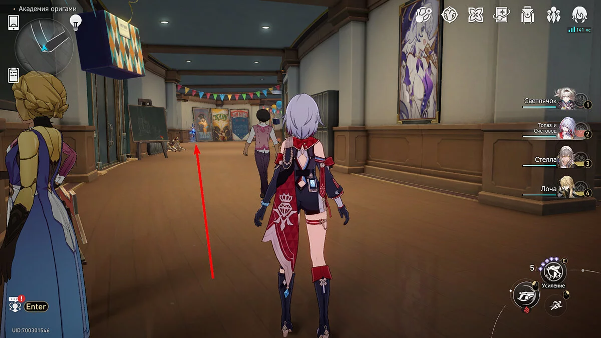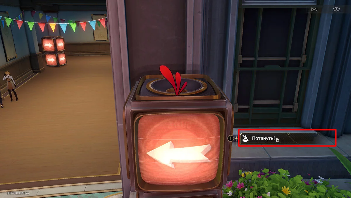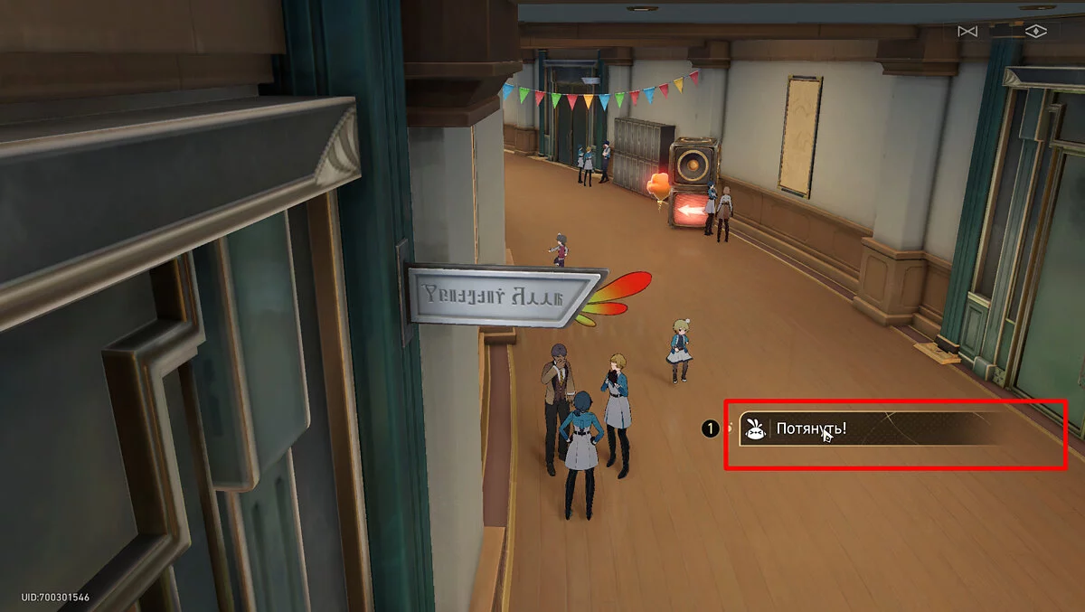 Выходите из аудитории и бегите вперёд к пространственному якорю. Не доходя до телепорта поднимите взгляд вверх. Под потолком будет висеть гирлянда с разноцветными флажками, рядом с которыми торчит пучок бледно-розовых перьев. Потяните за него, послушайте недовольства пёстрой пташки, и она удалится в своё гнездо.