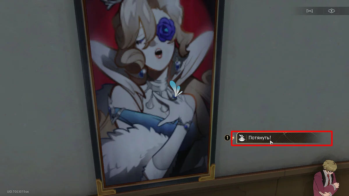 От предыдущей птички поверните налево, вглубь академии, и идите вперёд до упора. Ориентиром будет служить воздушный шар босса Камня. Поднимите глаза вверх и увидите портрет. В нём спрятана ещё одна пташка, что можно понять по торчащему хохолку голубого цвета. Потяните его и поговорите с влюблённым созданием.