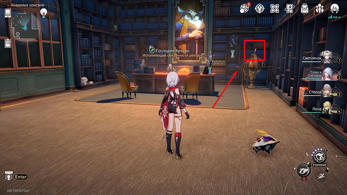 Предпоследняя пташка находится в кабинете ректора. От местоположения предыдущего птенца поднимитесь выше по ступенькам и перейдите в локацию. Найти оригами можно по торчащему хохолку из устройства, напоминающего глобус.