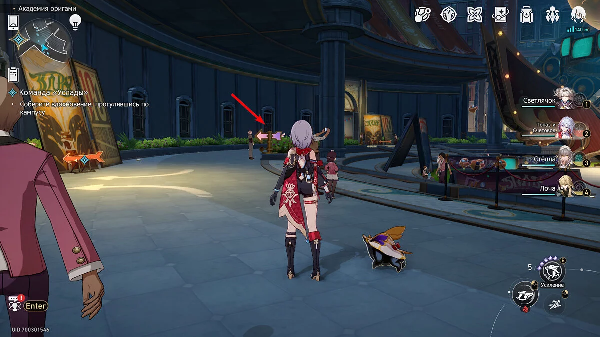 Продолжайте идти вперёд по улице. Оказавшись на развилке у статуи птицы, поверните налево и идите вперёд до поворотов. Один из них будет вести ко всё той же статуе, а второй вглубь академии. Около них будут две стрелочки-указателя: оранжевая и фиолетово-розовая. Идите ко второй, что будет стоять вблизи ступеней и увидите пучок перьев. Взаимодействуйте с ними и поговорите с пташкой.