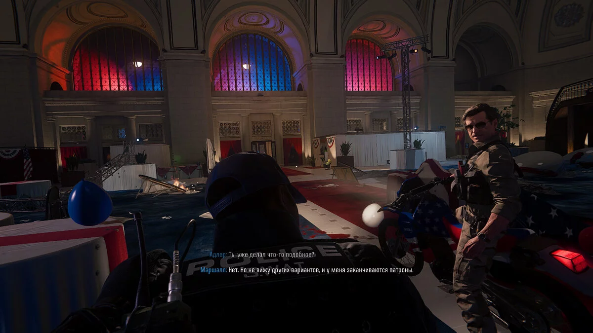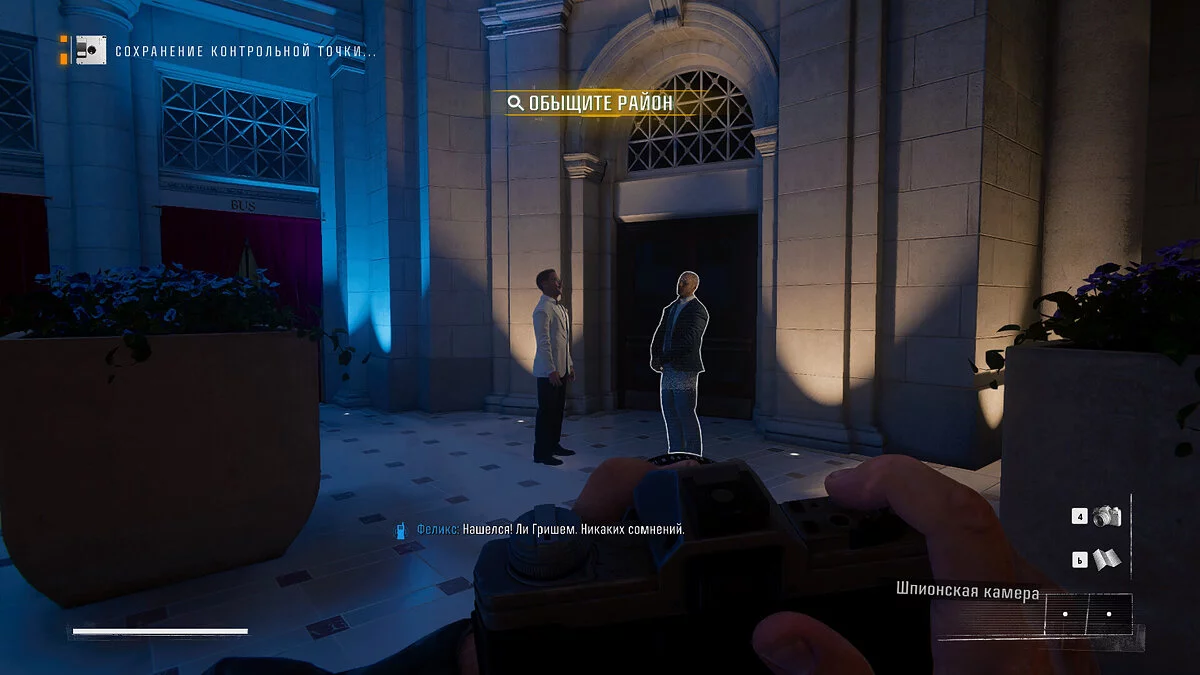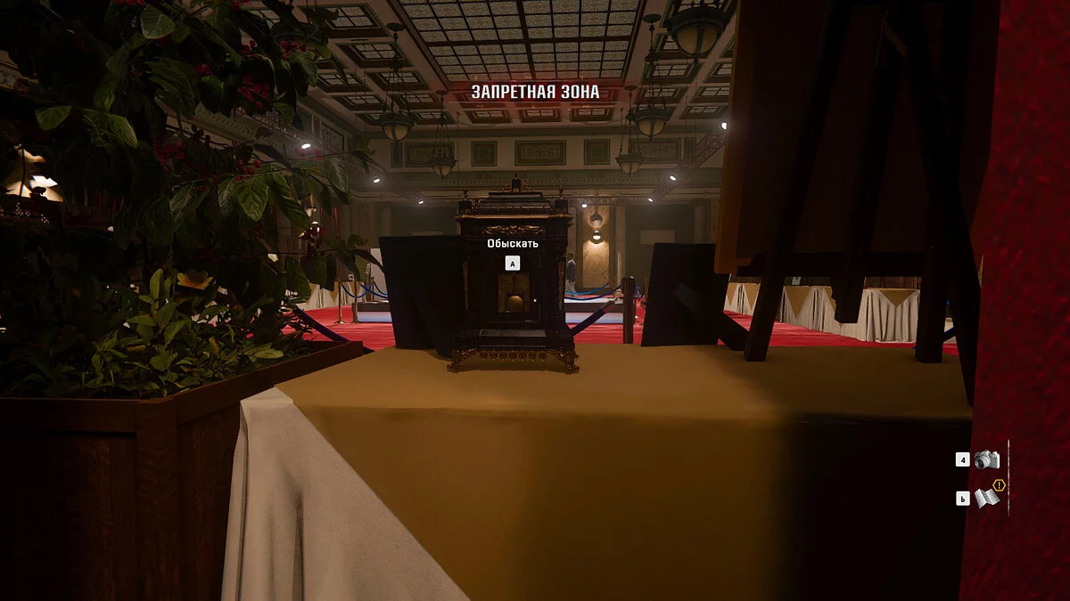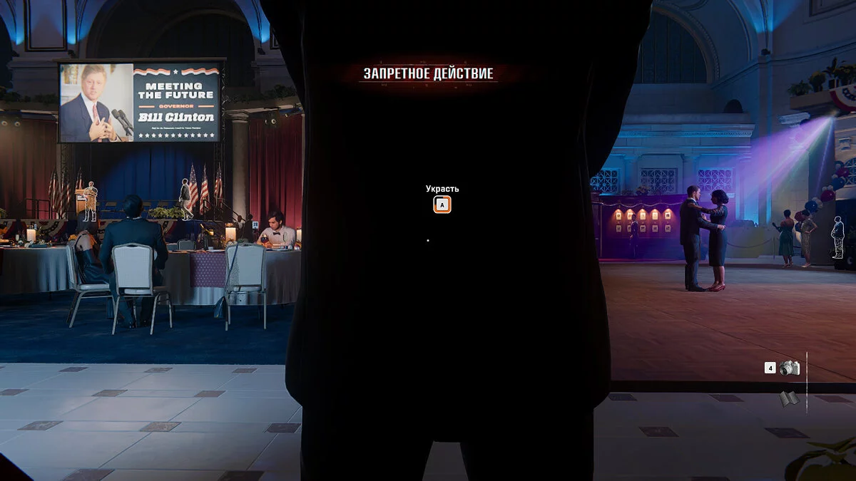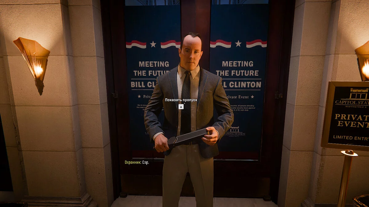 После того как вы сделаете снимок сенатора, направляйтесь в холл западной части здания, где ранее встречались с сенатором и губернатором. Двигайтесь в сторону магазина, а затем по коридору к бару. У барной стойки слева вы найдете дверь, ведущую на лестничную площадку. Поднимитесь наверх и устраните всех сотрудников охраны, чтобы обеспечить себе безопасность. После этого взаимодействуйте с люком, достаньте вещи из сумки и переоденьтесь.