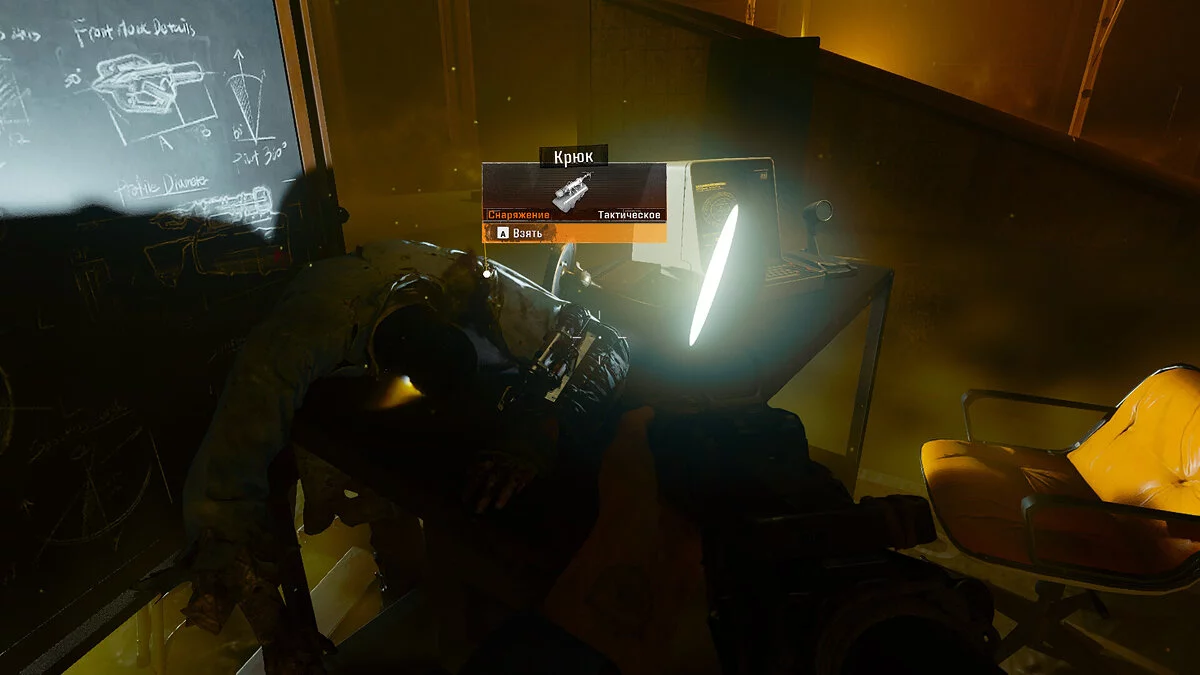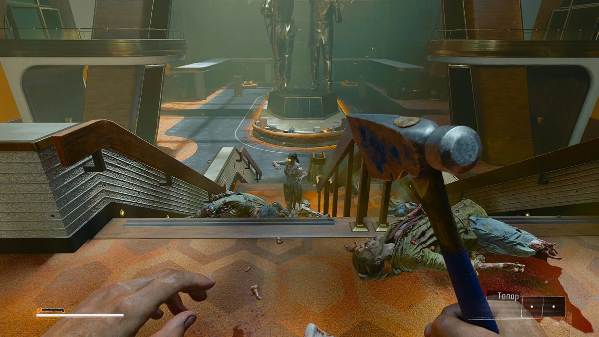 После этого спуститесь вниз и тщательно обыщите холл на наличие полезных предметов. Как только закончите, вернитесь и снимите крюк с трупа. Будьте осторожны: после этого действия на вас нападет монстр по имени «Директор». Используйте крюк, чтобы оказаться позади врага.