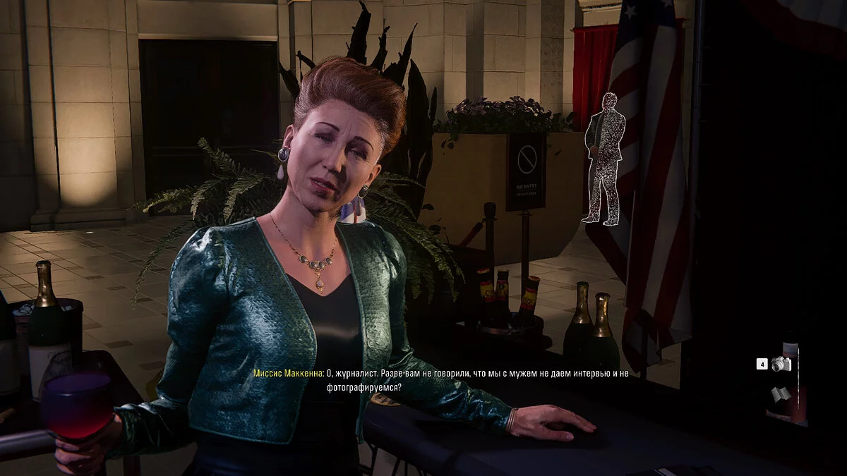 Выберите барную стойку и подойдите к жене Маккенна, чтобы завести с ней диалог. В ходе беседы вы узнаете о его молодой помощнице, что может оказаться полезной информацией. Затем направляйтесь в аукционный зал и взаимодействуйте с Сев.