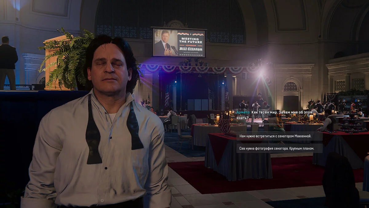 Пройдите на прием и пообщайтесь с охранником, чтобы получить доступ к мероприятию. Затем займите место №14 за столиком, откуда будет удобно наблюдать за происходящим. Достаньте фотоаппарат и увеличьте зум, удерживая клавишу W. Сделайте снимок сенатора Маккенна, который ведёт беседу с губернатором Клинтоном.