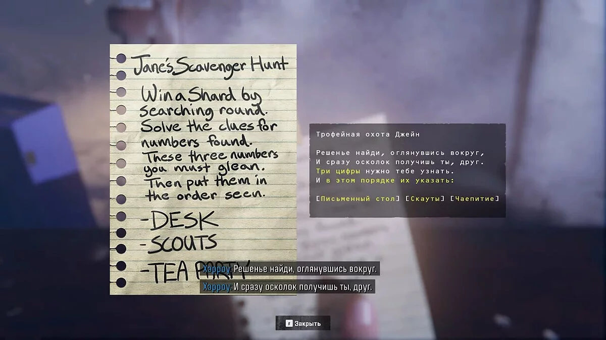 Осмотрите заметку рядом с запертым ящиком. В ней будут указаны три ключевых слова, которые помогут вам найти пароль от замка. Эти слова индивидуальны для каждого игрока, в нашем случае это — «Письменный стол», «Скауты» и «Чаепитие».
