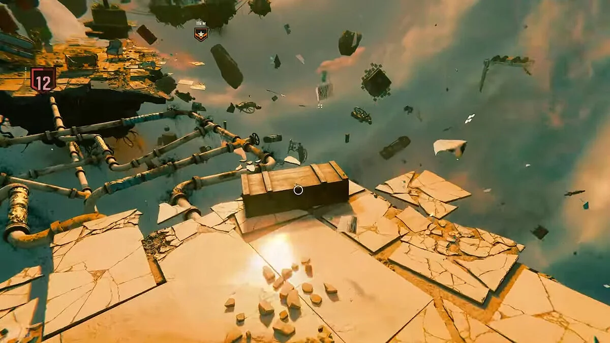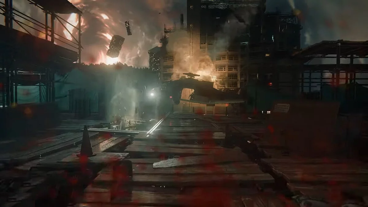 Попытавшись войти в офис Джейн Хэрроу, вы окажетесь на обломках. Прыгайте по обломкам слева, переберитесь через бочки и заберите автомат из ящика.