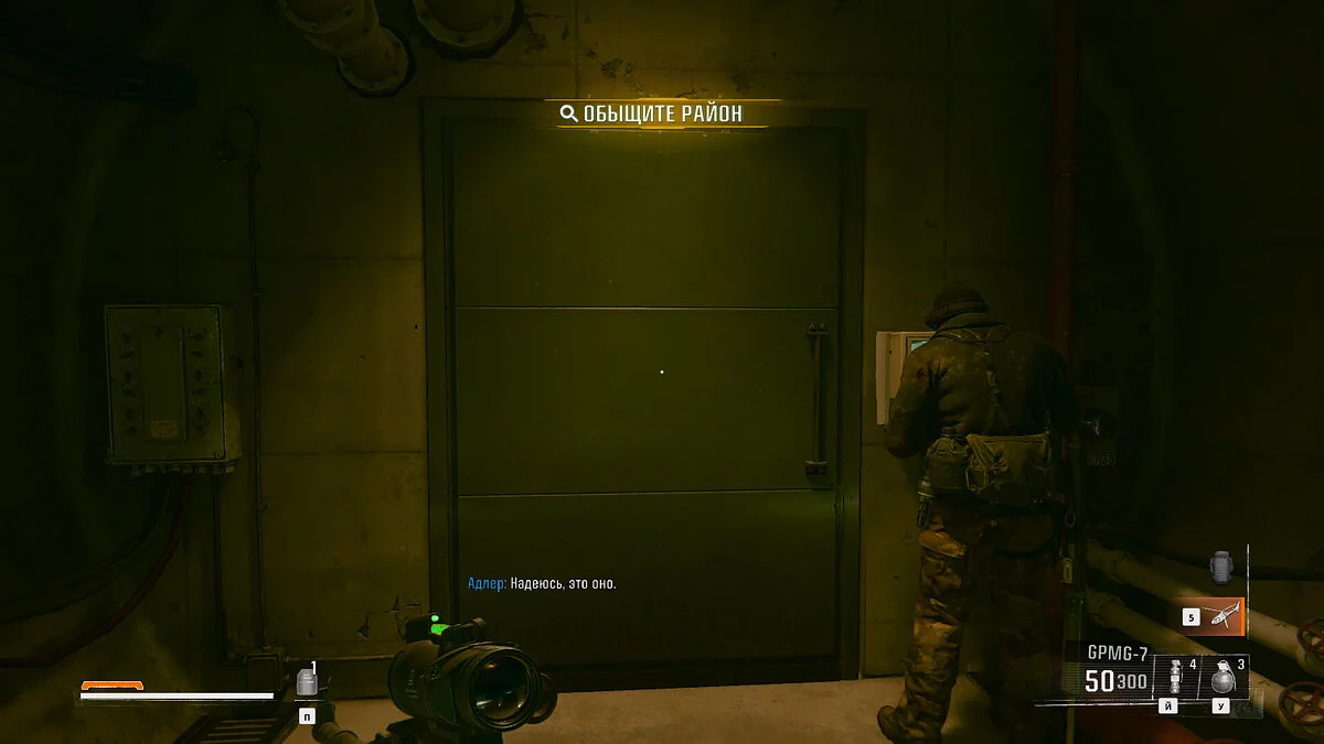Ликвидируйте всех врагов в коридоре и постарайтесь спасти мужчину по имени Адлер. Следуя за ним по пути, из лифта покажется враг с пулеметом. Если у вас есть взрывчатка или гранаты — используйте данное оружие для устранения врага и войдите в лифт. Отправляйтесь на этаж выше и ждите, пока трос лифта не оборвется. В этот момент зажмите клавишу F, чтобы ухватиться за перила.