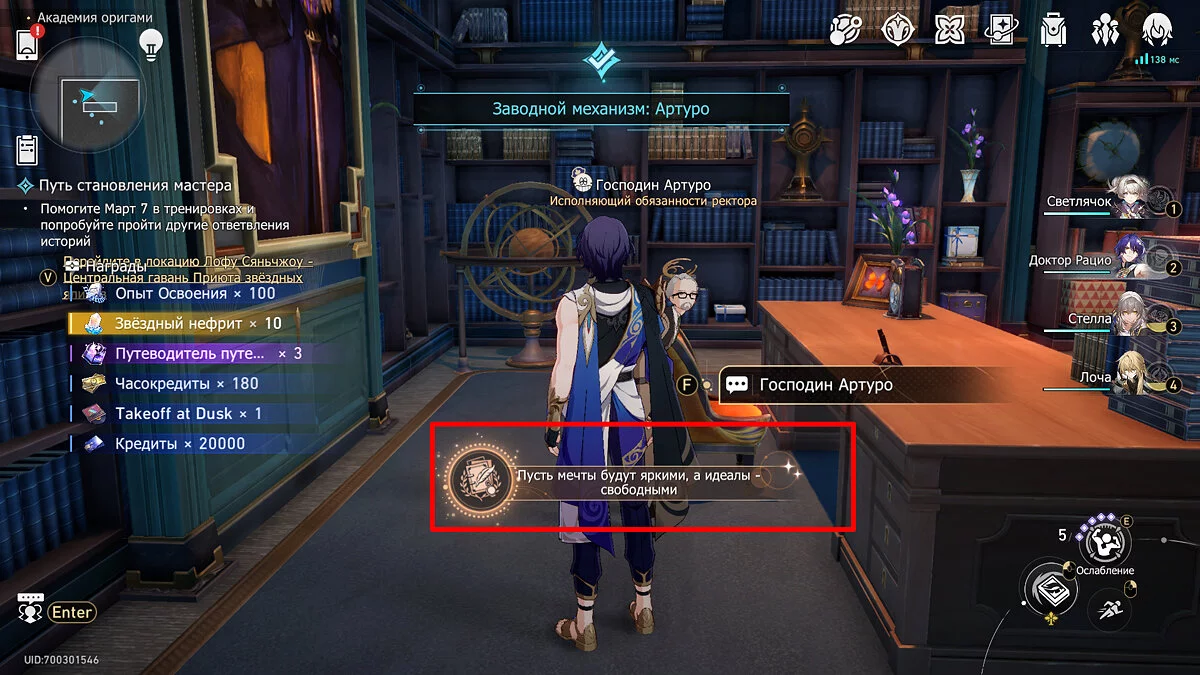 На полпути вас остановит профессор Филин, который напишет письмо Артуро. Вернитесь к нему в кабинет и передайте его адресату. После этого вы получите ачивку и 10 единиц звёздного нефрита.