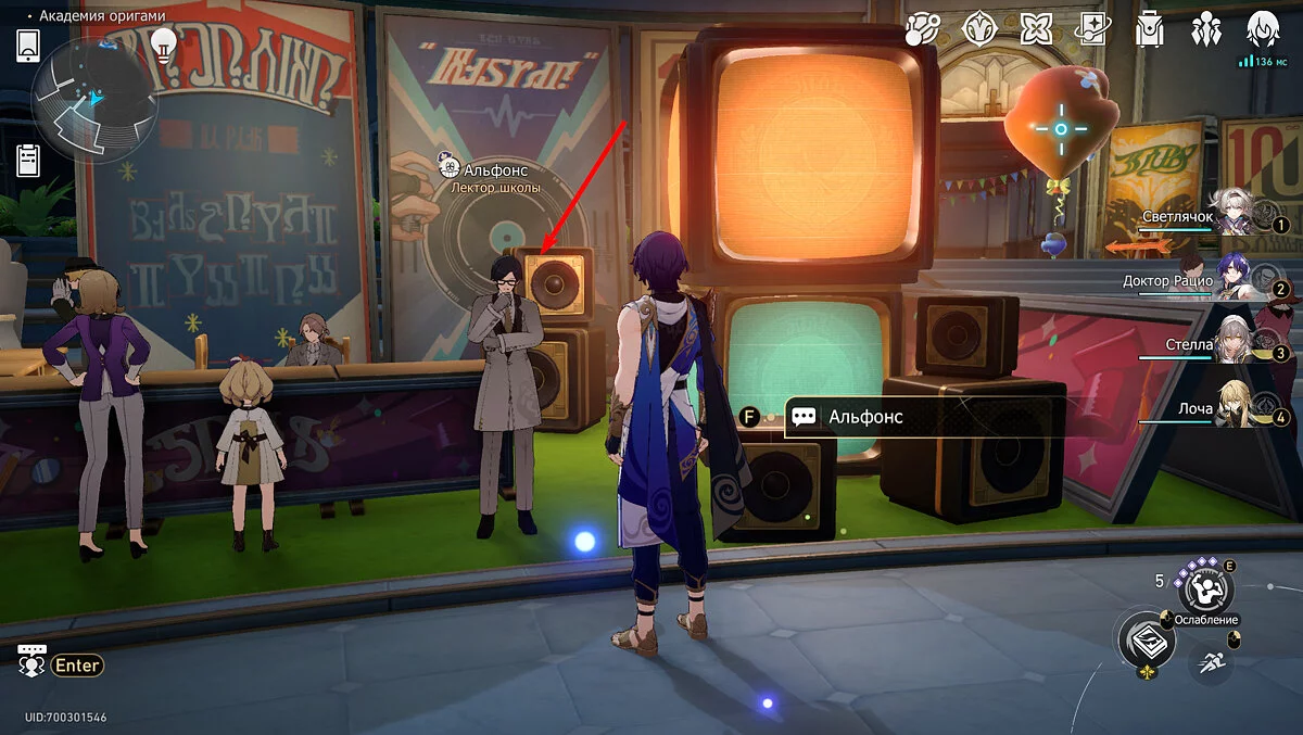 Пробегите немного назад по коридору и идите к центральной локации со статуей птицы-оригами. Не доходя до неё, сверните чуть левее — около стола с баннерами и мониторами стоит персонаж в очках и с чёрными волосами. Это и есть искомый Альфонс.