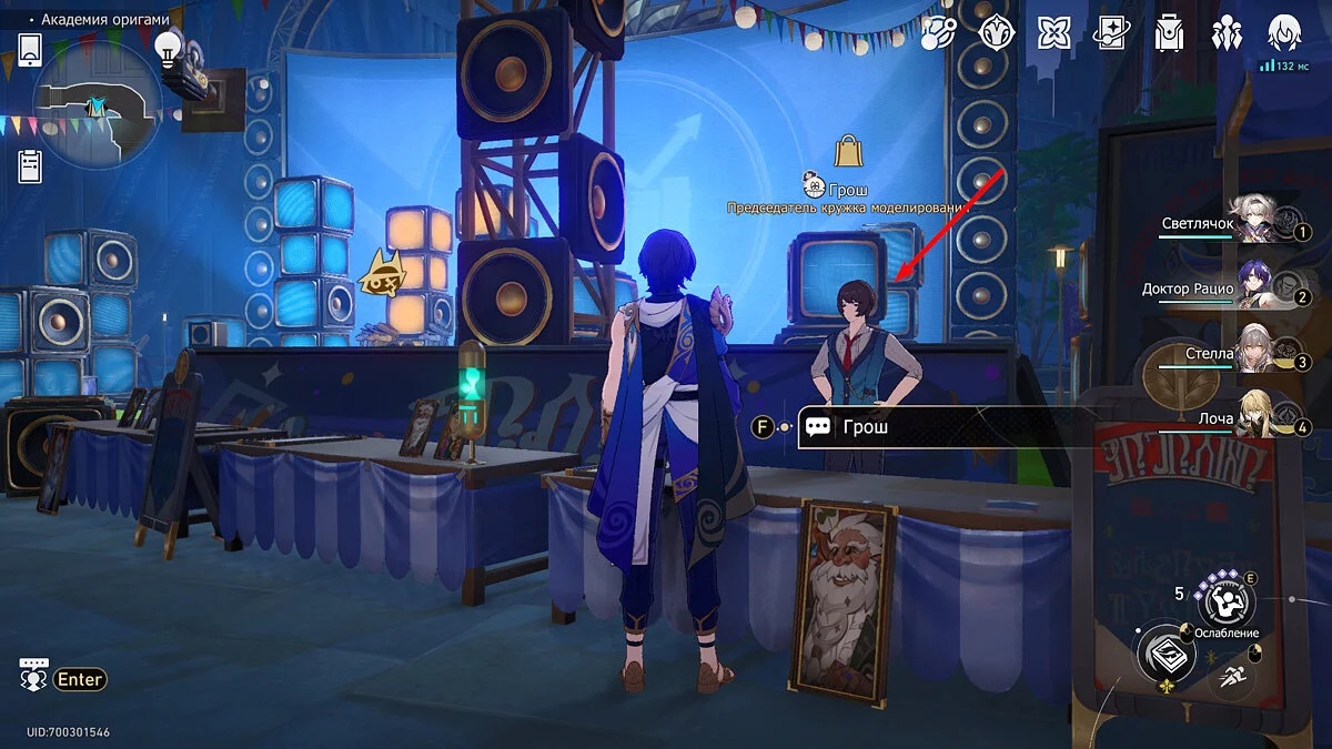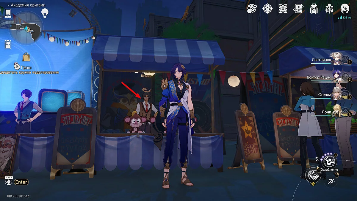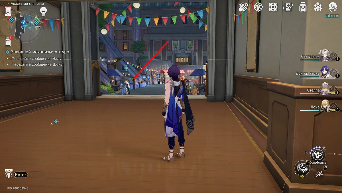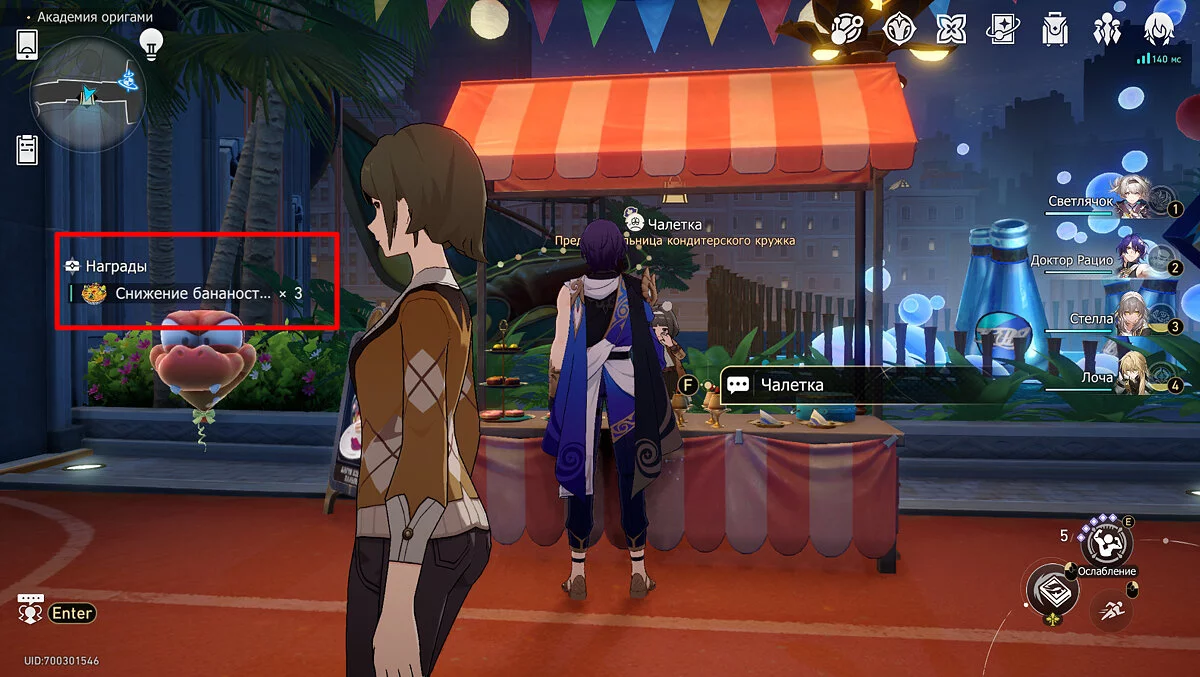 Ещё одного знакомого по сюжету 2.6 персонажа можно отыскать на Творческой ярмарке. Воспользуйтесь пространственным якорем с таким же названием и пройдите в небольшой коридор. За первой же стойкой слева будет стоять робкая пепеши по имени Чалетка. Поговорите с ней и воспользуйтесь заводным механизмом.