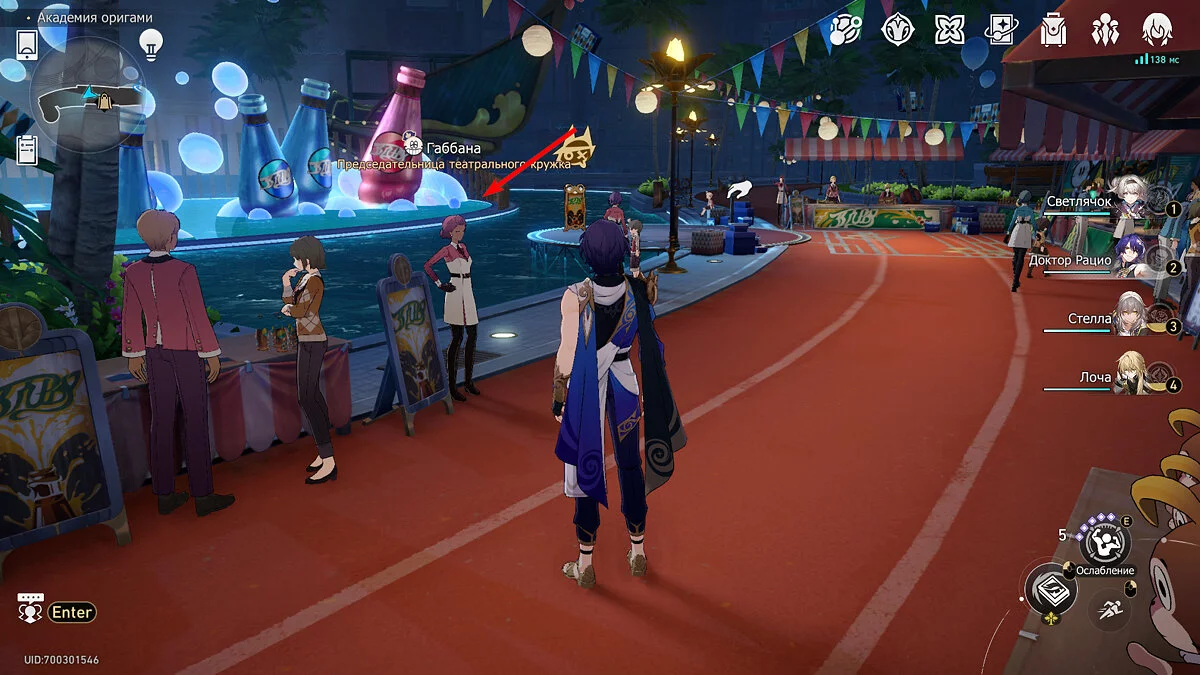 От Чалетки пройдите немного вперёд по Творческой Ярмарке и увидите Габбану — председателя театрального кружка, которая то и дело мелькала в миссии Освоения патча 2.6.