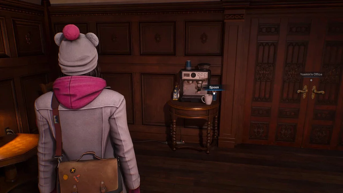 Далее направляйтесь в библиотеку — из почтового отделения поверните направо, чтобы найти и поговорить с Гвен. Осмотрите запертый шкаф в библиотеке. Затем вернитесь в кабинет Виня и возьмите ложку, которая лежит рядом с кофемашиной.