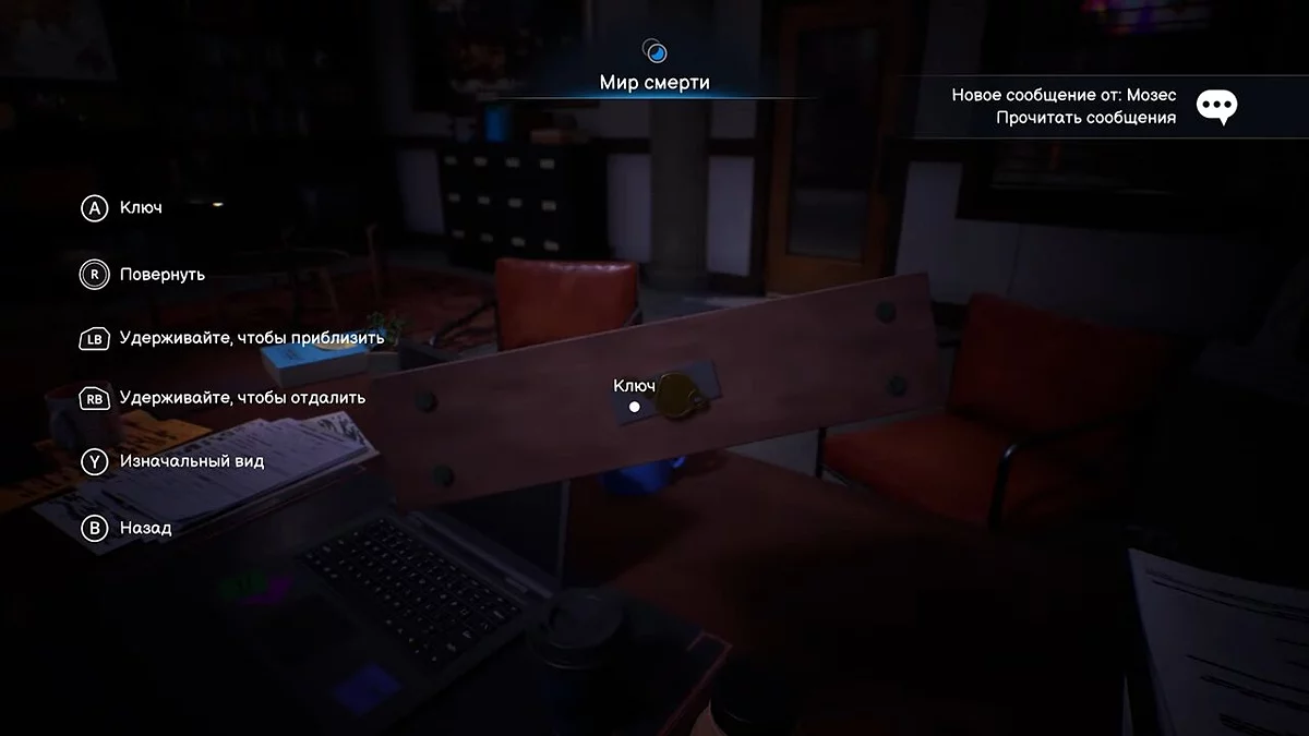 Осмотрите все предметы на столе, а после изучите флешку Гвен. Наполните кружку кофе, после чего в комнату войдет Олдермен. Просмотрите все возможные варианты диалога с ним, а затем поочередно зажмите клавиши L и R, чтобы переместиться в прошлое.