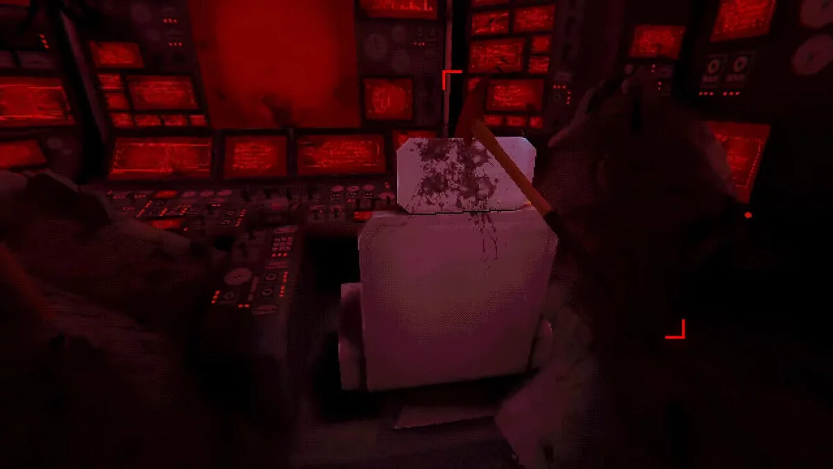 Отправляйтесь в кабину, где внутри вы обнаружите топор, застрявший в сиденье. Возьмите его и вернитесь в главный зал. Вместо торта на столе теперь лежит капитан. Используйте топор на капитане, и после этого экран снова погаснет.