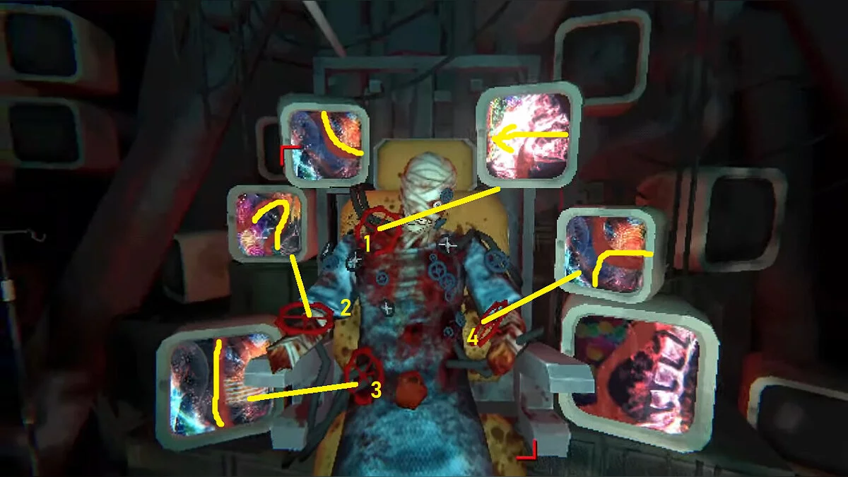 Снова повернитесь лицом к Керли. Наша цель — заставить его поесть, но для этого нужно отрегулировать углы мониторов. Чтобы заставить Керли поесть, нужно правильно настроить клапаны вокруг его тела. Каждый из них связан с отдельным монитором, и регулировка изменяет направление движения еды. Если клапаны будут настроены неправильно, Керли начнет чувствовать тошноту. На мониторах будет отображаться линия, которая укажет, какой клапан нужно повернуть, чтобы направить еду в правильное место.