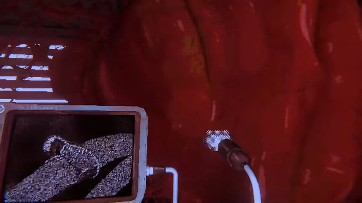 Просто бегите прямо, пока не доберетесь до Керли. После того как закончится разговор с ним, экран потемнеет и вы окажетесь в вентиляции. Идите вперёд и поднимите ультразвуковое оборудование с подноса справа. С его помощью вы сможете осмотреть нарост в вентиляции и выяснить, что находится внутри.