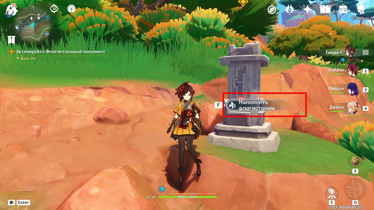 Паймон обнаружит странный монумент, именуемый флогистоновым. Считается, что если его активировать, то произойдёт что-то хорошее, однако сделать это могут только натланцы. Впрочем, вы все равно можете попробовать. Подойдите к статуе ближе (перед этим собрав флогистоновые частицы и наполнив полоску), а затем нажмите на «наполнить флогистоном», после чего поговорите с Качиной.