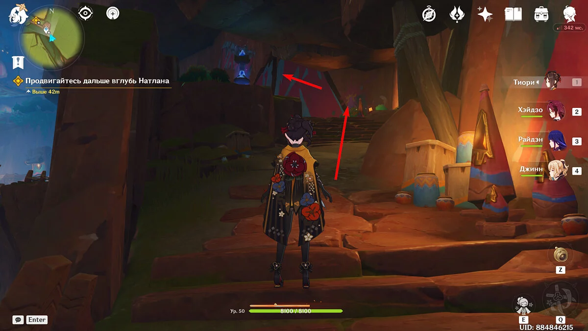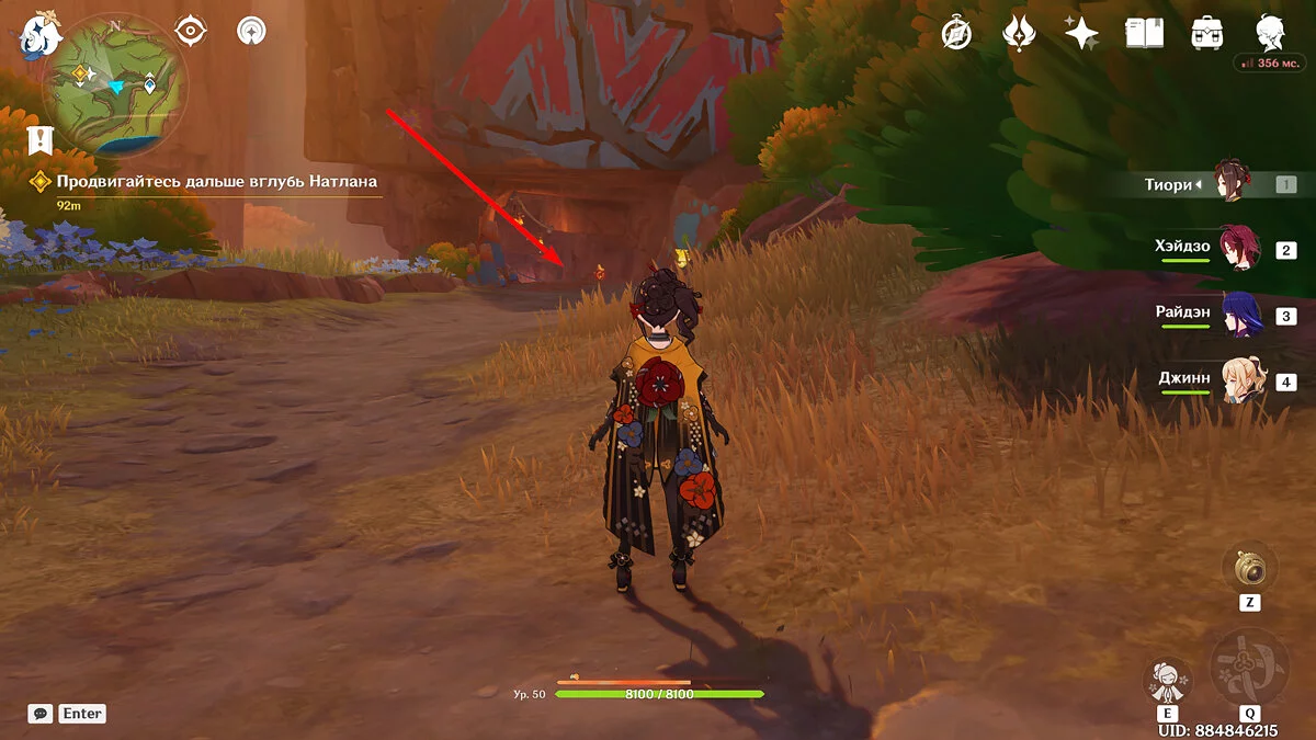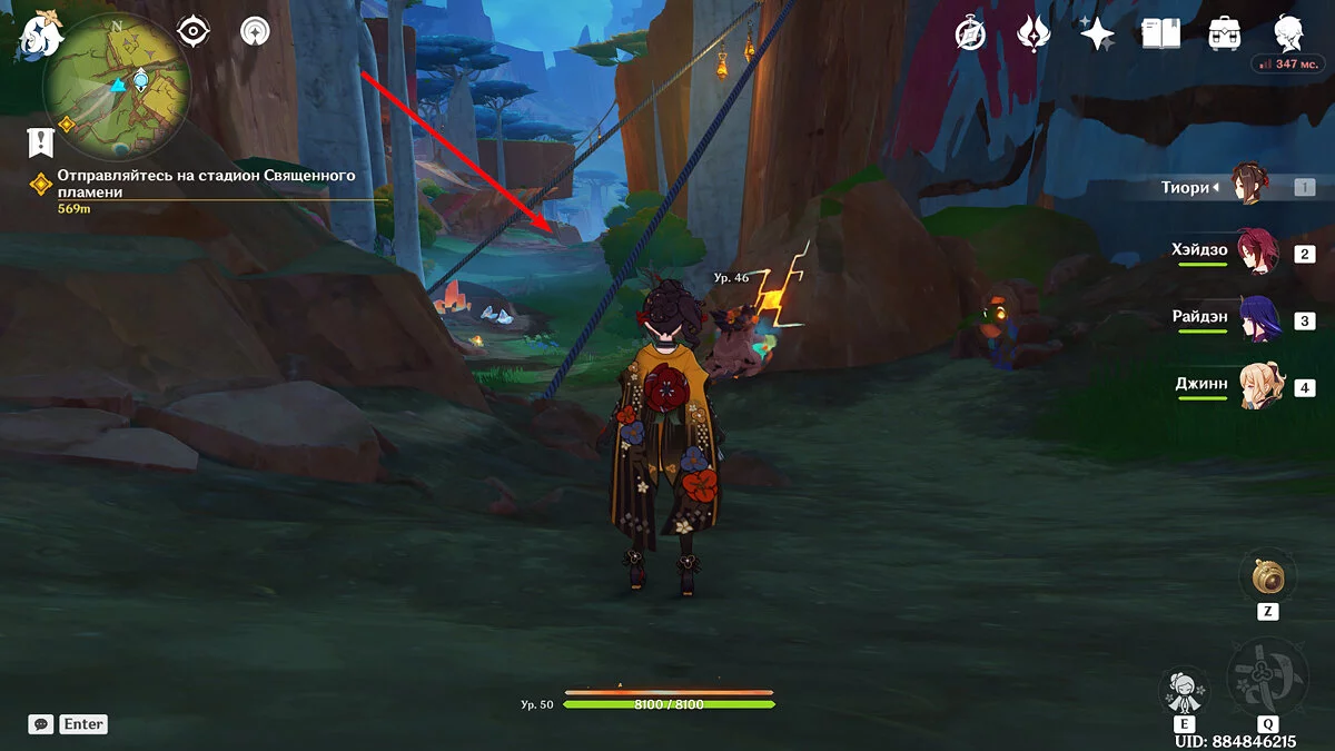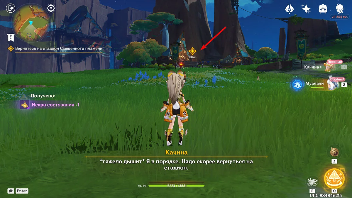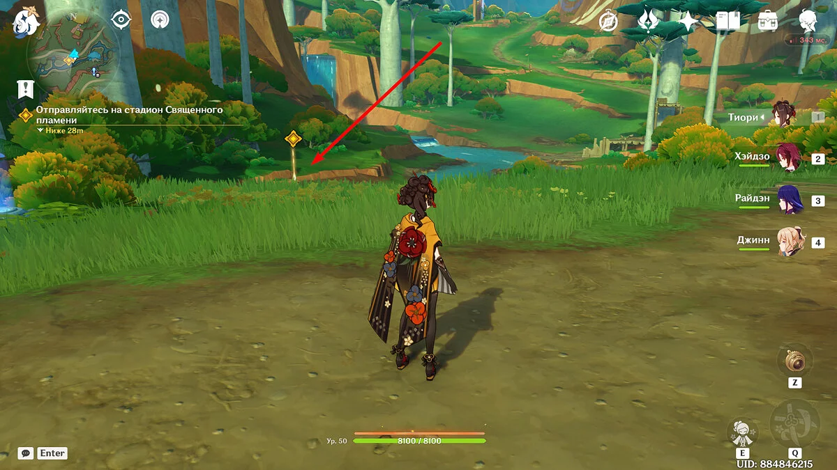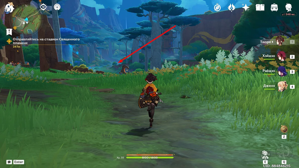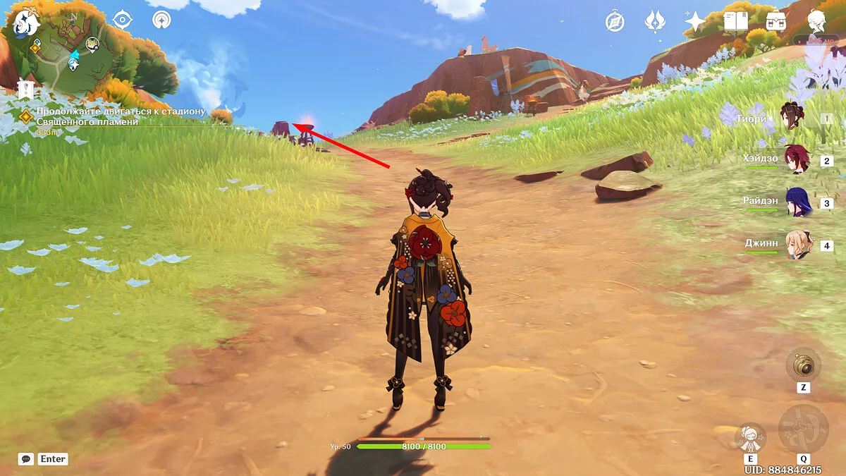 От Статуи Архонта продолжайте идти к стадиону Священного пламени. Для этого просто бегите по главной дороге прямо, никуда не сворачивая. Ориентируйтесь на высоких динозавров вдалеке и длинные деревья с голубой листвой. Кроме того, прямо около нужного места уже есть телепорт, поэтому, если вы уже исследовали территорию Натлана и открыли все точки, смело перемещайтесь туда.