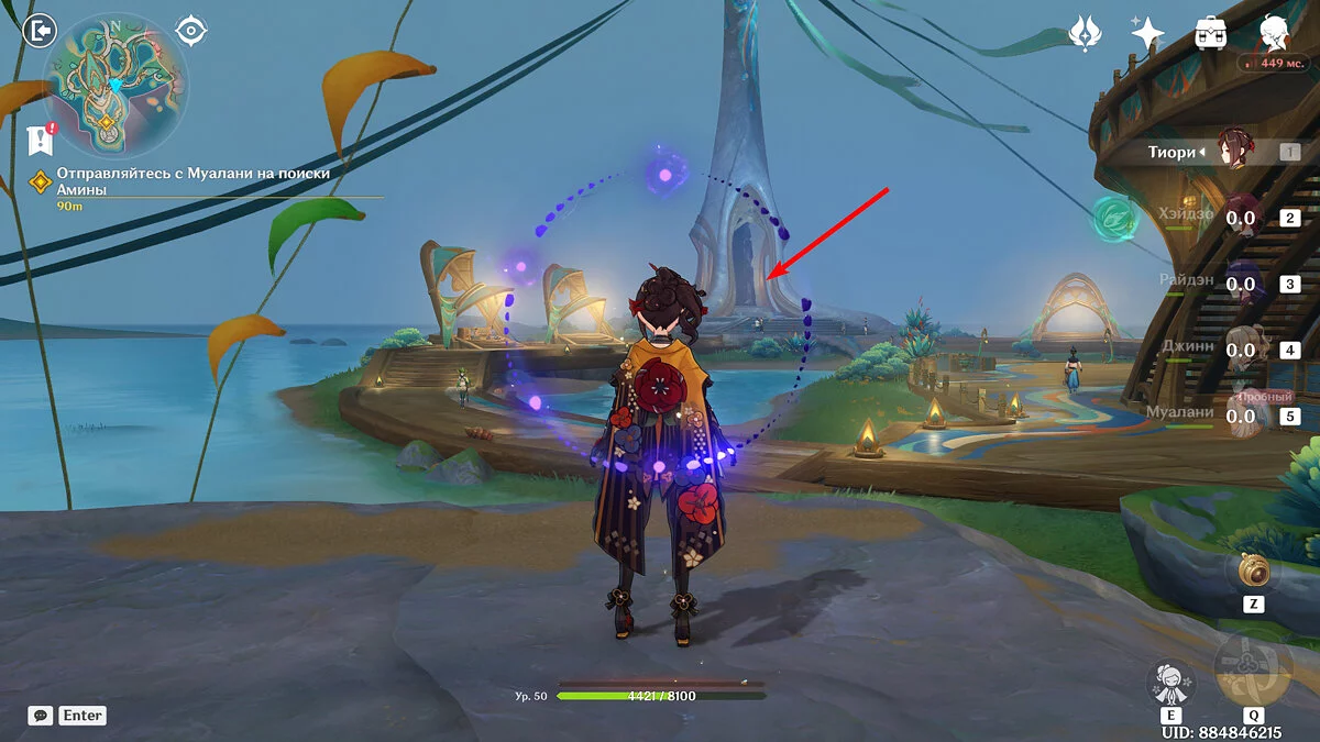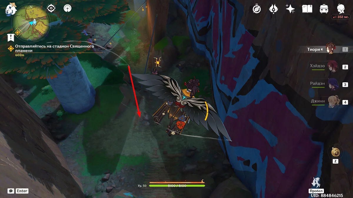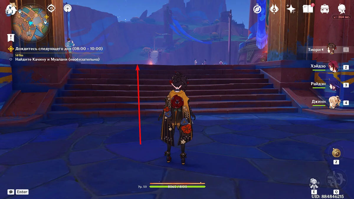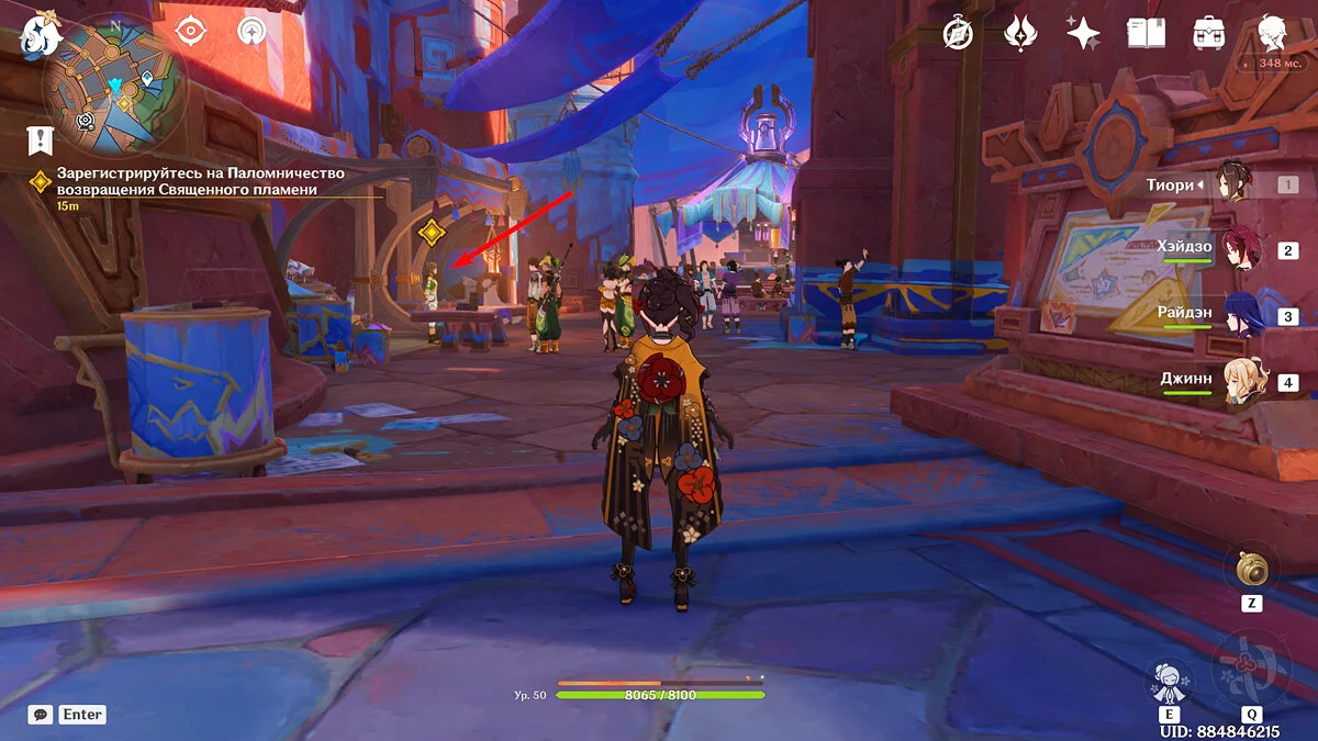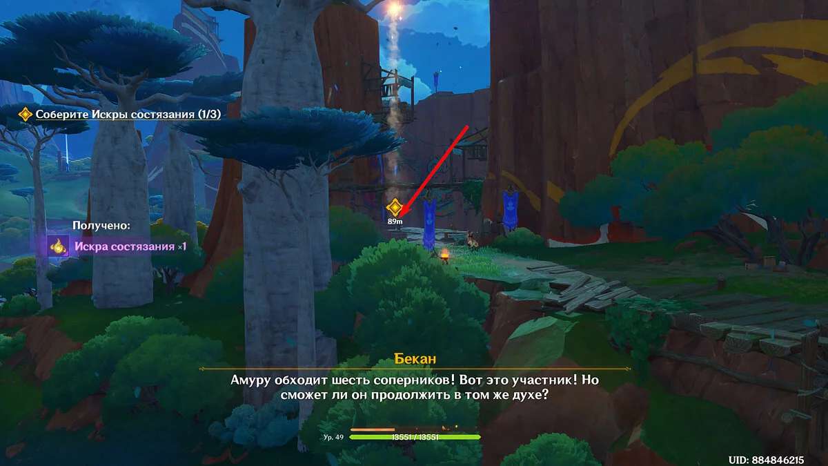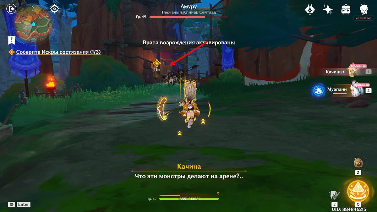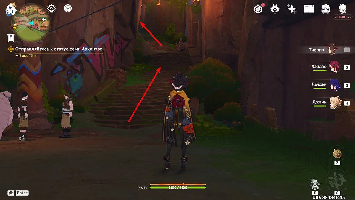 От Статуи Архонта продолжайте идти к стадиону Священного пламени. Для этого просто бегите по главной дороге прямо, никуда не сворачивая. Ориентируйтесь на высоких динозавров вдалеке и длинные деревья с голубой листвой. Кроме того, прямо около нужного места уже есть телепорт, поэтому, если вы уже исследовали территорию Натлана и открыли все точки, смело перемещайтесь туда.