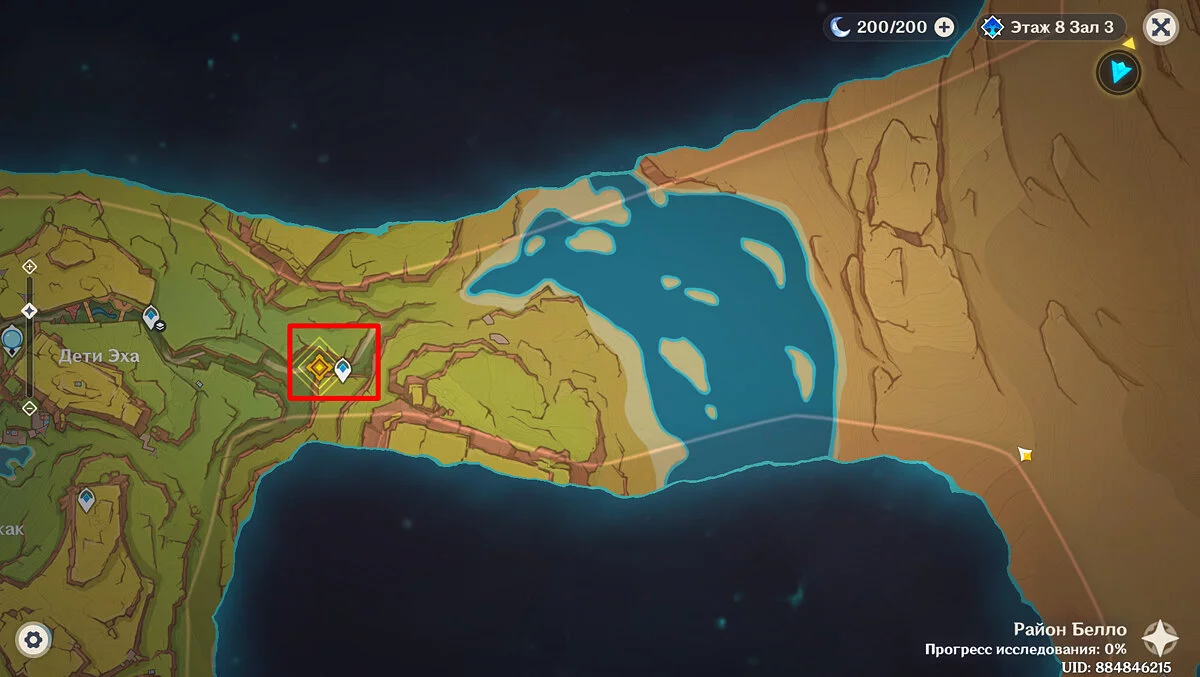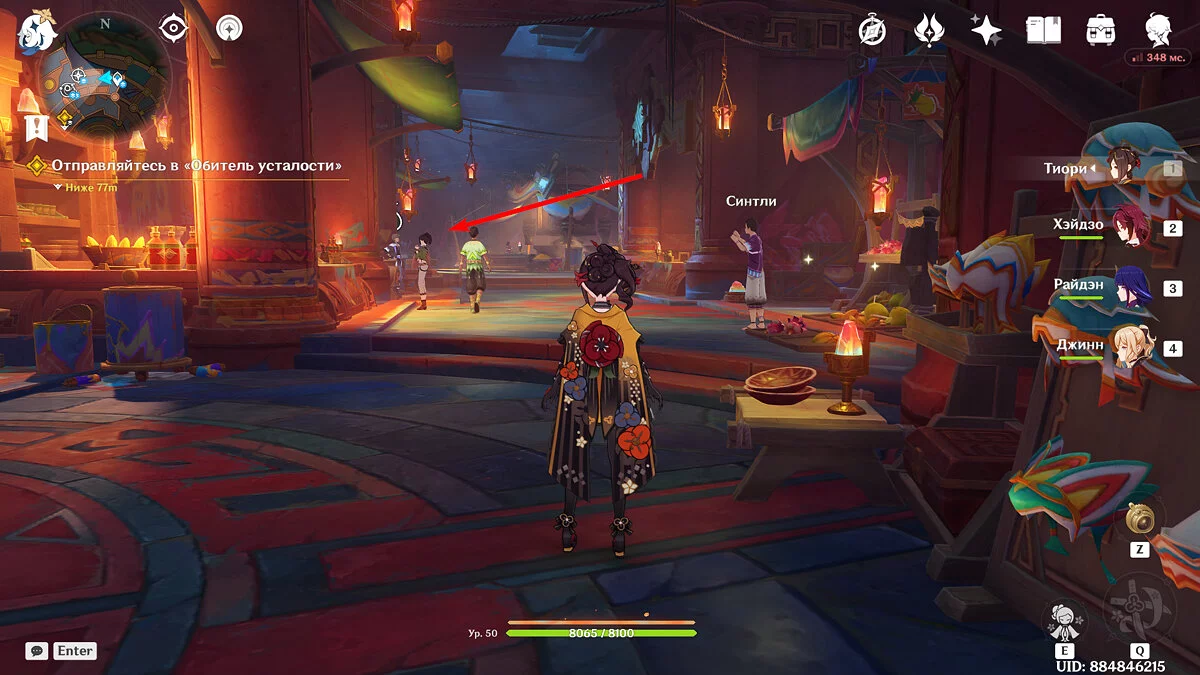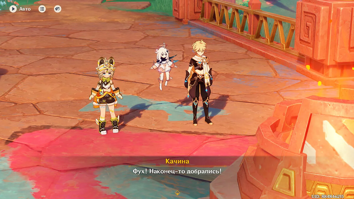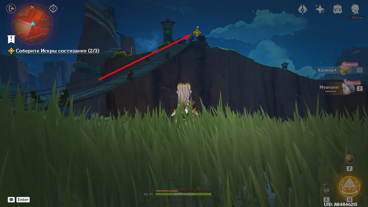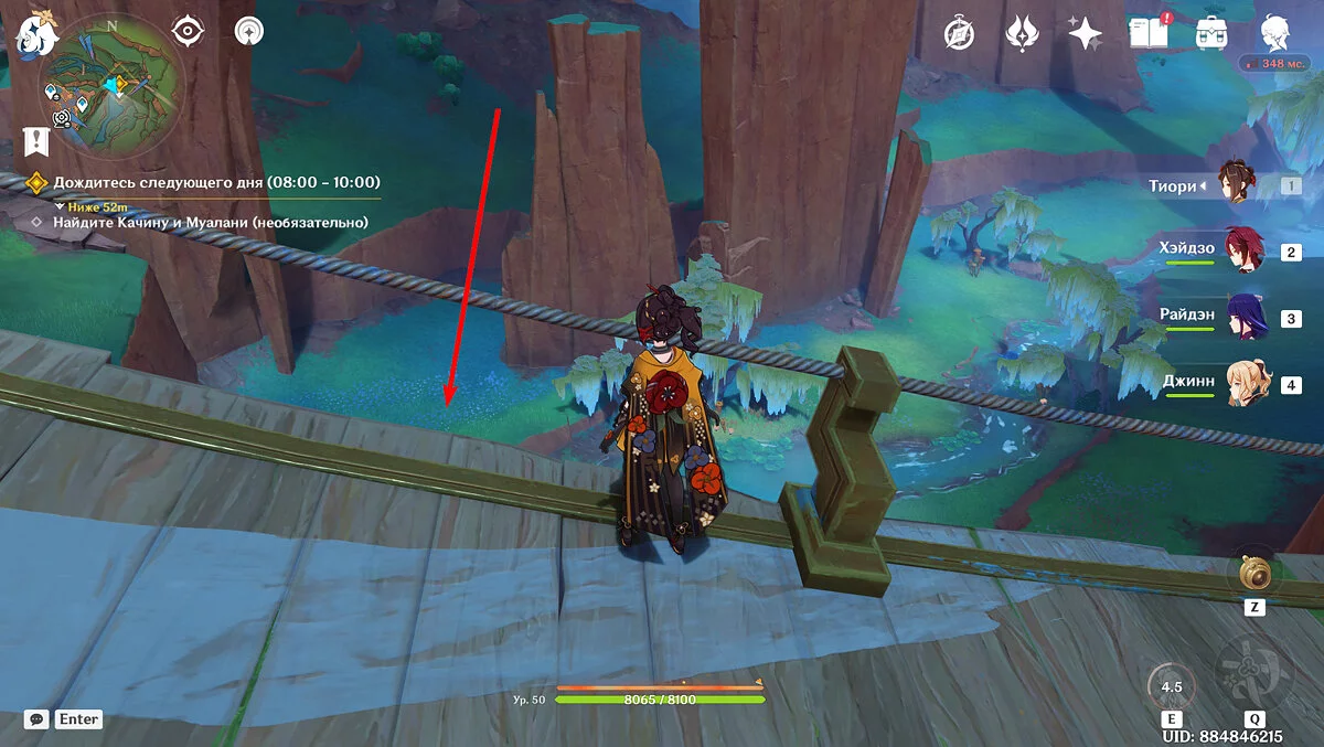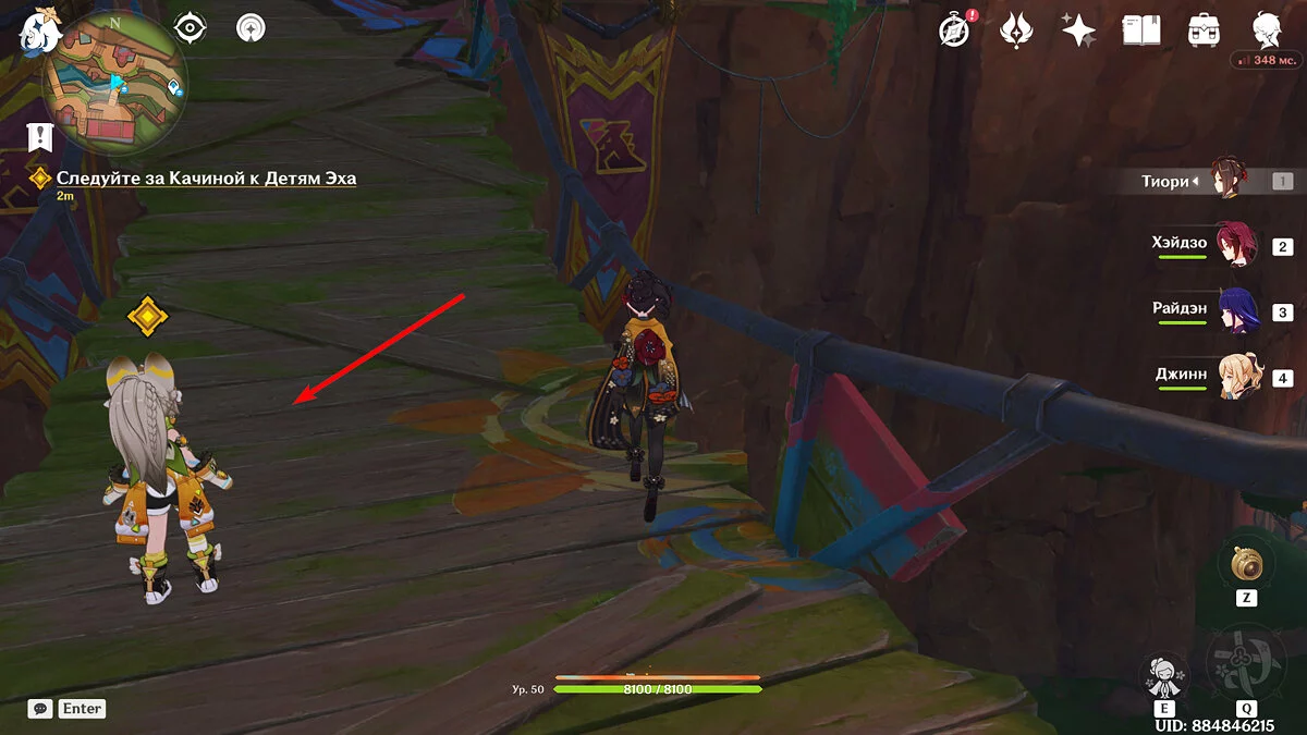 По нему вам предстоит попасть в племя «Дети Эха». Поговорите с Паймон и продолжайте двигаться вперёд, к небольшому ущелью: именно там и расположено племя. Следуйте по дороге пересеките небольшой навесной мост пока не увидите девочку и двух персонажей.